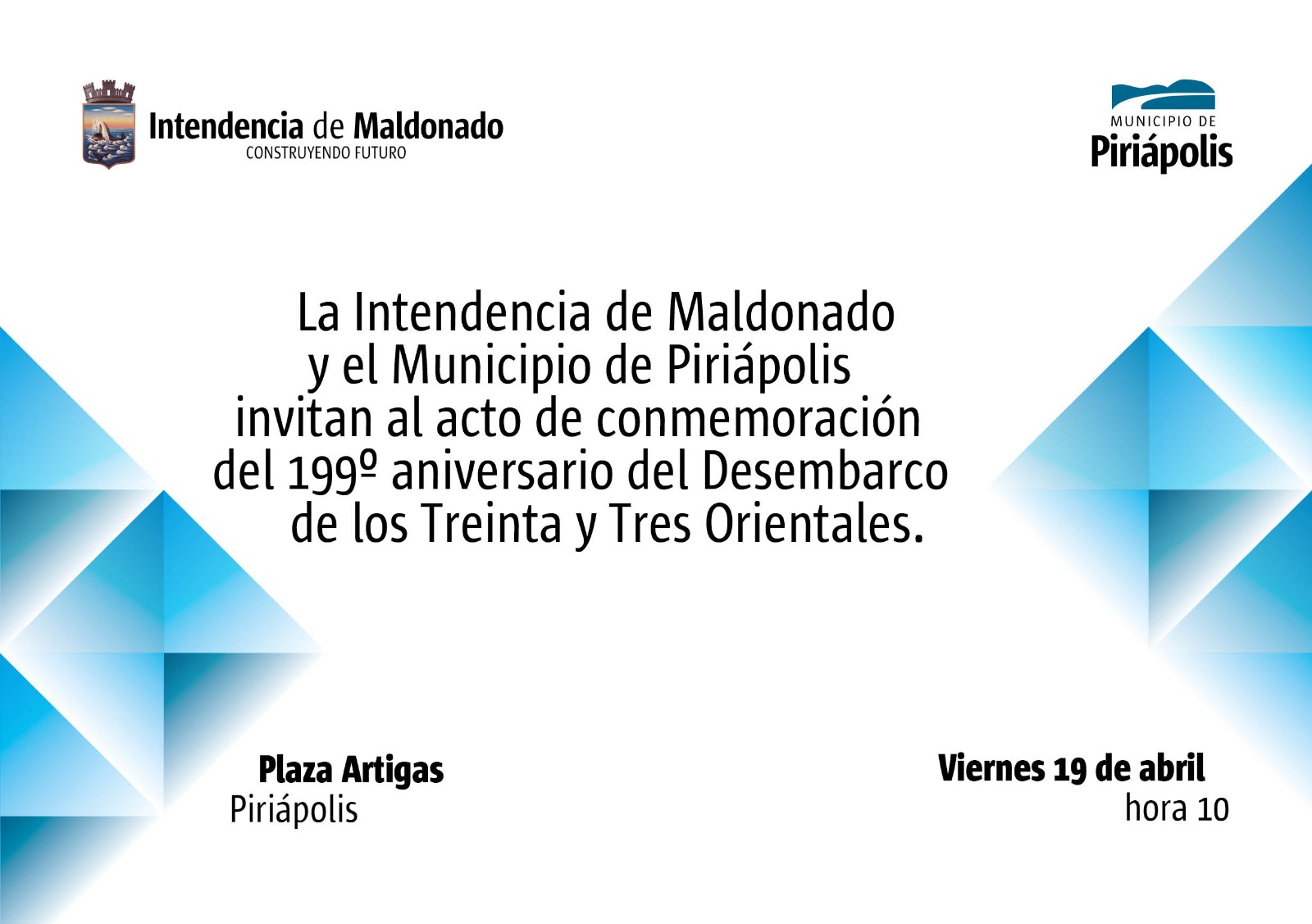 19 de Abril: 199 años del Desembarco de los 33 Orientales; acto en Piriápolis con desfile de caballería gaucha. La ceremonia, que será encabezada por el intendente de Maldonado, Enrique Antía y por el alcalde de Piriápolis, René Graña, comenzará a partir de la hora 10:00 en Plaza Artigas (Tucumán entre Emilia Alperovich y Santos Negro), con la entonación de las estrofas del himno naconal (letra Francisco Acuña de Figueroa y música Francisco José Debali), interpretado por la Orquesta Departamental de Maldonado.