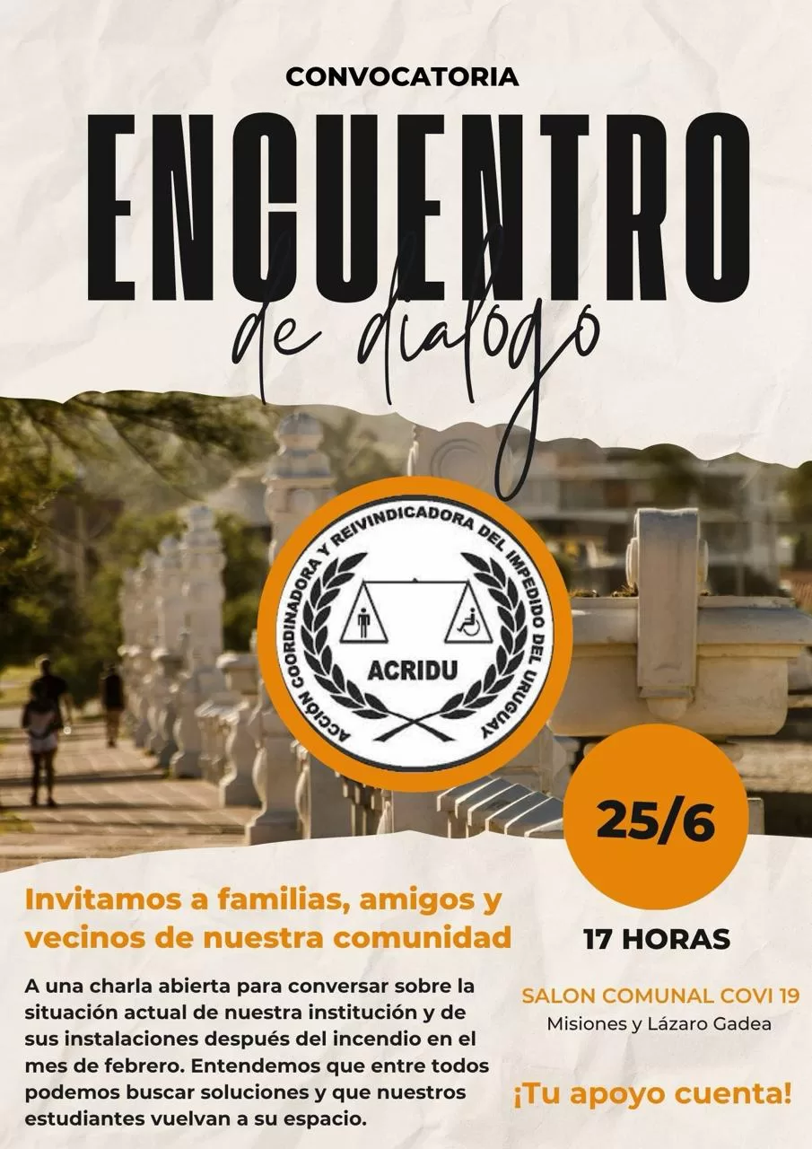 .ACRIDU Piriápolis convoca a la comunidad para dialogar sobre el futuro de su local tras el incendio. La Asociación Coordinadora y Reivindicadora del Impedido del Uruguay (ACRIDU) invita a vecinos, familias y personas comprometidas con la inclusión y los derechos a participar de un encuentro de diálogo este miércoles, 25 de junio a las 17:00, en el salón comunal Covi 19, ubicado en Misiones y Lázaro Gadea.