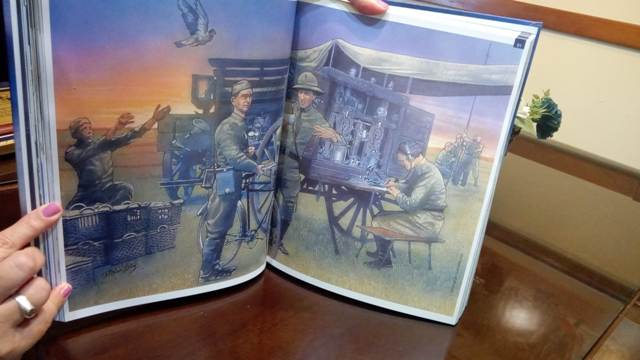 El artista plástico Paulo Miños Stay utilizó la técnica de la acuarela, una técnica sobre papel o cartulina con colores diluidos en agua. Se trata de una reconstrucción artística e histórica que representa al Batallón de Ingenieros Nro. 4 Telegrafistas (nombre del actual Batallón de Comunicaciones Nro. 1), operando en su especialidad en campaña durante la década de 1930. Se observa la Estación Rodante de Radiotelegrafía en pleno funcionamiento. El radiotelegrafista está realizando la recepción de un mensaje en Código Morse. En tanto, un Oficial, caracterizado por el casco de corcho de la época, recibe de un agente de transmisión de la Sección de Ciclistas, un mensaje del Puesto de Comando al que se apoya. Este debe ser enviado por la Estación inmediatamente. A la izquierda, se observa la vía alternativa de enviar órdenes e información a través de Palomas mensajeras, y al fondo soldados de la Unidad acomodando una antena para la Estación Radiotelegráfica.