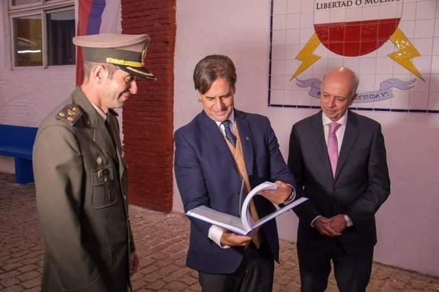 Foto superior y portada: la pintura de Paulo Miños Stay es recibida por el Presidente de la República, Luis Lacalle Pou. A la izquierda, el Ministro de Defensa, Javier García. A la derecha, el Tte. Cnel. Renato Lantes, Jefe del Batallón de Comunicaciones Nro. 1, Unidad que al cumplir su Centenario confió en el trabajo de este artista piriapolene, y en la investigación del historiador Gastón Goicoechea para la producción de un libro del Centenario (se puede observar dicho libro en la foto, también entregado a Presidencia de la República).