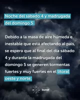 Advertencia meteorológica: se esperan tormentas fuertes en gran parte del país este fin de semana. El Instituto Uruguayo de Meteorología (Inumet) emitió una advertencia ante la llegada de condiciones climáticas adversas que afectarán al país desde la noche del sábado 4 hasta la madrugada del lunes 6 de octubre.