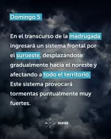 Durante el domingo 5, se prevé el ingreso de un sistema frontal por el suroeste, que se desplazará hacia el noreste, afectando progresivamente a todo el territorio nacional. Este fenómeno podría intensificar las tormentas, con episodios de gran intensidad.