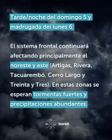 La situación se agravará en la tarde y noche del domingo, extendiéndose hasta la madrugada del lunes 6, cuando el sistema frontal impacte principalmente en el noreste y este del país, incluyendo los departamentos de Artigas, Rivera, Tacuarembó, Cerro Largo y Treinta y Tres. En estas zonas se esperan precipitaciones abundantes, actividad eléctrica intensa, rachas de viento muy fuertes y posible caída de granizo.