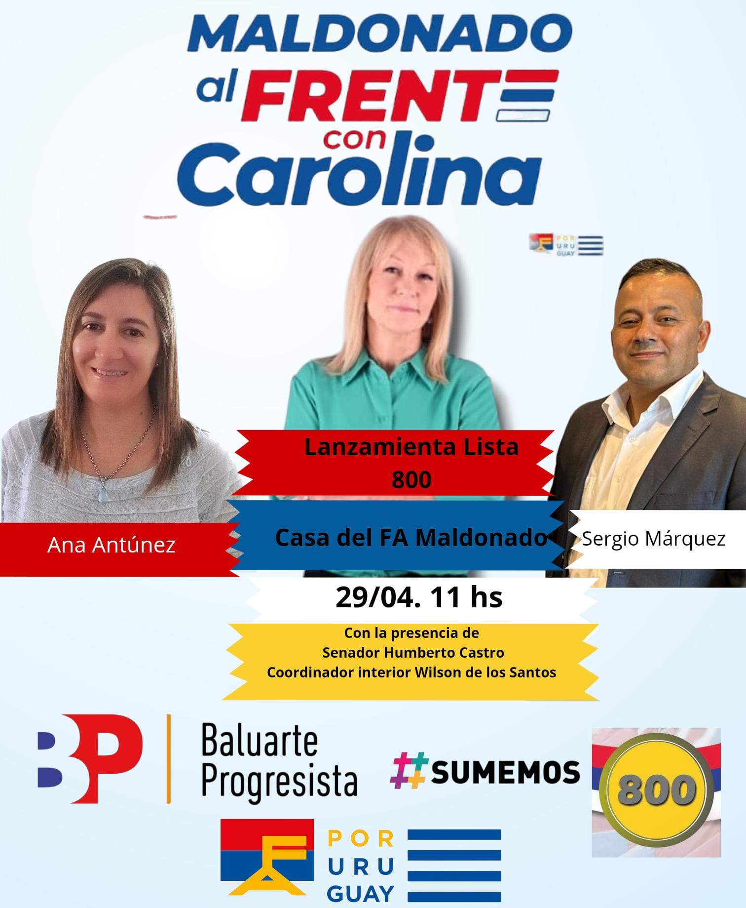 Este lunes 29 de abril se realiza el lanzamiento de la lista 800 del sector Baluarte Progresista, con Ana Antúnez y Sergio Márquez a la diputación, en la Casa del FA Maldonado (Batlle Ordóñez esq. Lavalleja). Acompañan el senador Humberto Castro y el coordinador sectorial del interior Wilson de los Santos, junto a la presidenta departamental de la fuerza política Silvana Amoroso.