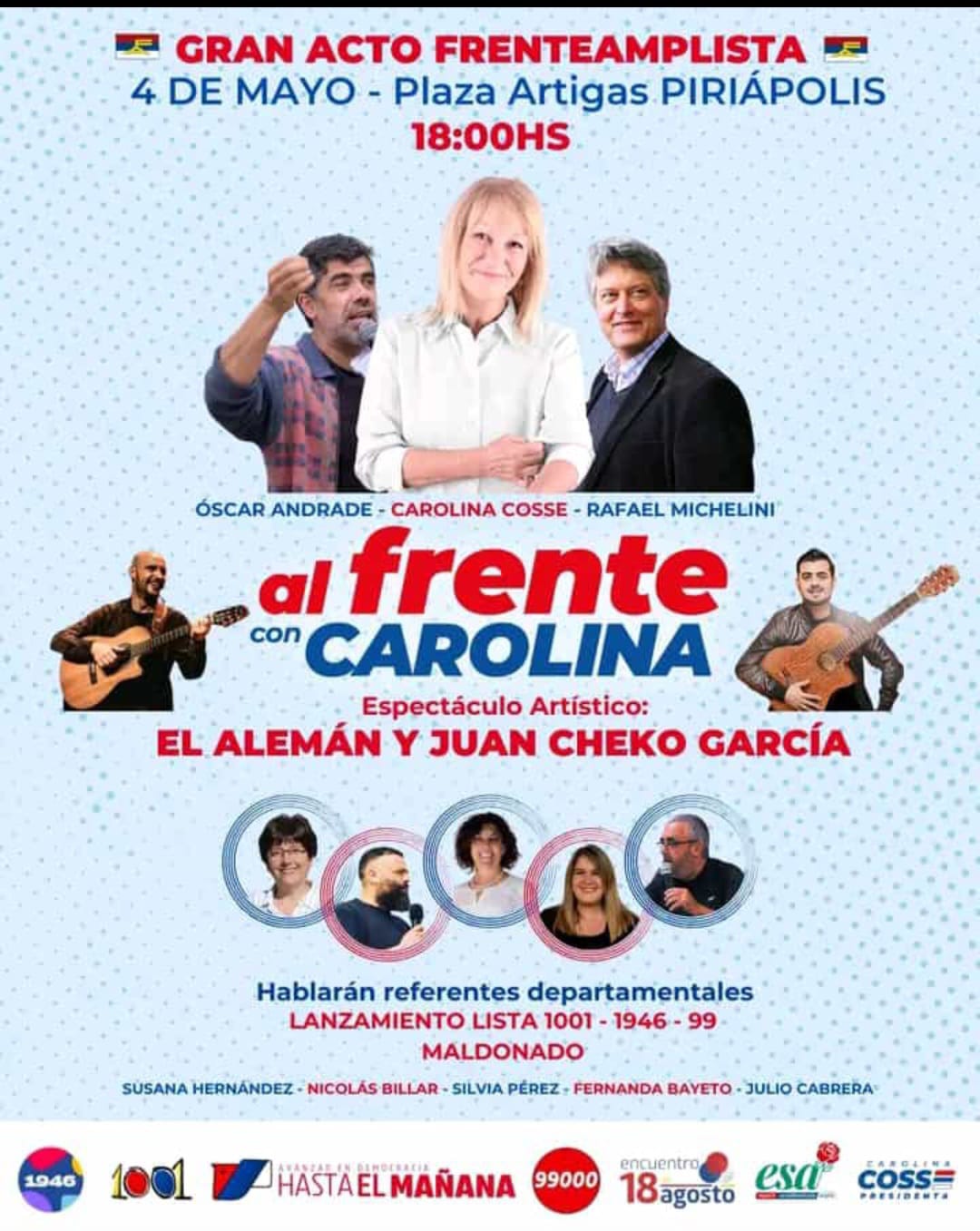 El sábado 4 de mayo, llegará a Maldonado la precandidata Carolina Cosse junto a Óscar Andrade y Rafael Michelini, para un gran acto frenteamplista en la Plaza Artigas de Piriápolis, a las 18hs, a modo de lanzamiento de la lista 1001 – 1946 – 99. El Alemán y Juan Cheko García ambientarán con su música la jornada.