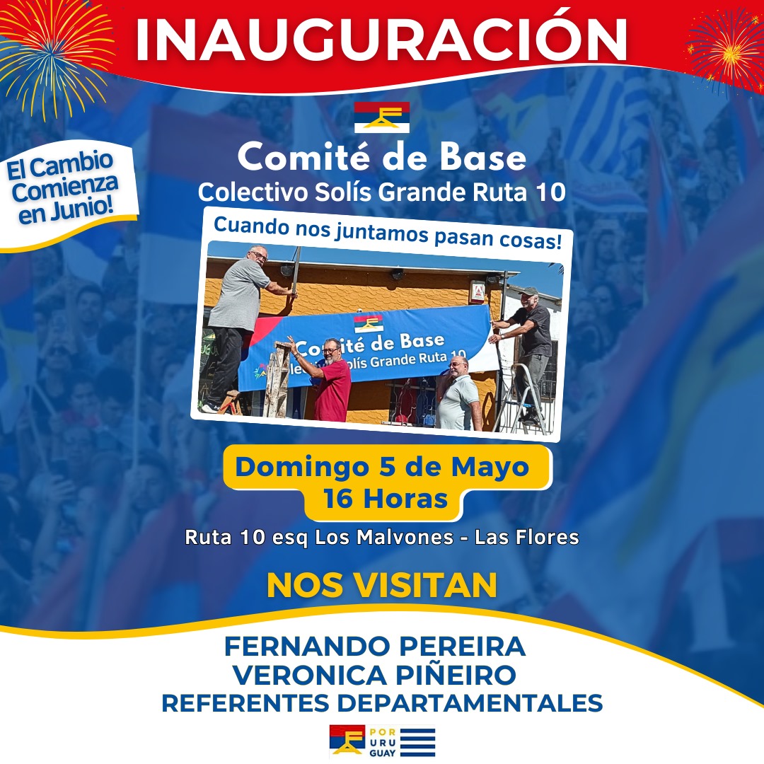 El domingo 5 de mayo a las 16hs se inaugura un nuevo comité de base frenteamplista, en Las Flores a la altura de ruta 10 esq. Los Malvones. El Comité de Base Solís Grande – Ruta 10, recibirá a Fernando Pereira y Verónica Piñeiro como presidente y vicepresidenta nacionales del FA. Ese mismo día se realizará una amplia barriada en Zona Oeste.