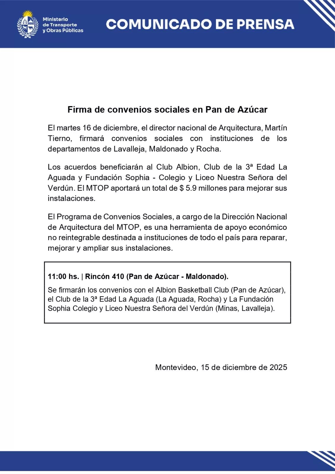 Este martes 16 de diciembre, a las 11:00 horas, se realizará en la sede del Albion BBC de Pan de Azúcar la firma de convenios sociales entre el Ministerio de Transporte y Obras Públicas (MTOP) y tres instituciones de los departamentos de Lavalleja, Maldonado y Rocha.