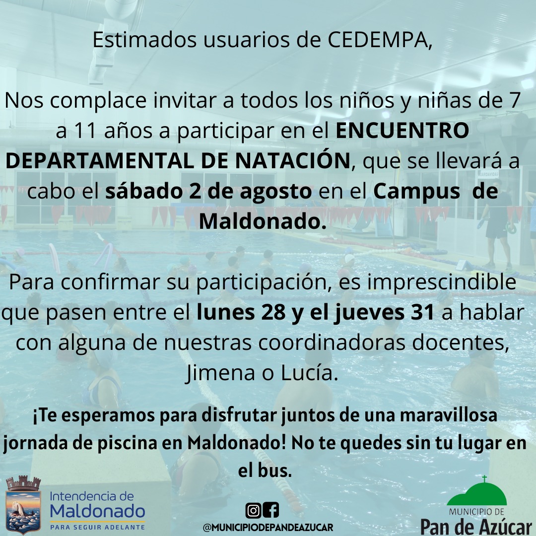 Con el objetivo de promover el deporte y fortalecer la convivencia entre niños y niñas del departamento, el Municipio de Pan de Azúcar se prepara para participar en una nueva edición del Encuentro Departamental de Natación. La actividad, organizada por la Intendencia de Maldonado, convoca a participantes de CEDEMPA y se perfila como una jornada de integración, recreación y aprendizaje en torno a la práctica acuática.