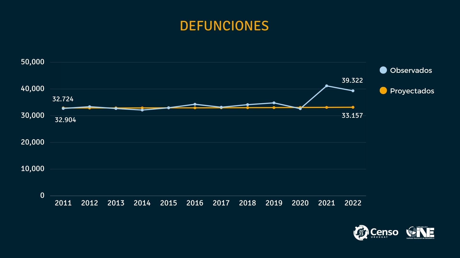 En Uruguay se estaría adelantando algunos años el proceso de decrecimiento poblacional: desde el año 2021 el número de nacimientos es menor al número de defunciones. A la luz de esta tendencia y, de no mediar reversión de la misma o procesos inmigratorios importantes, la población del Uruguay seguirá una tendencia decreciente hacia el futuro.