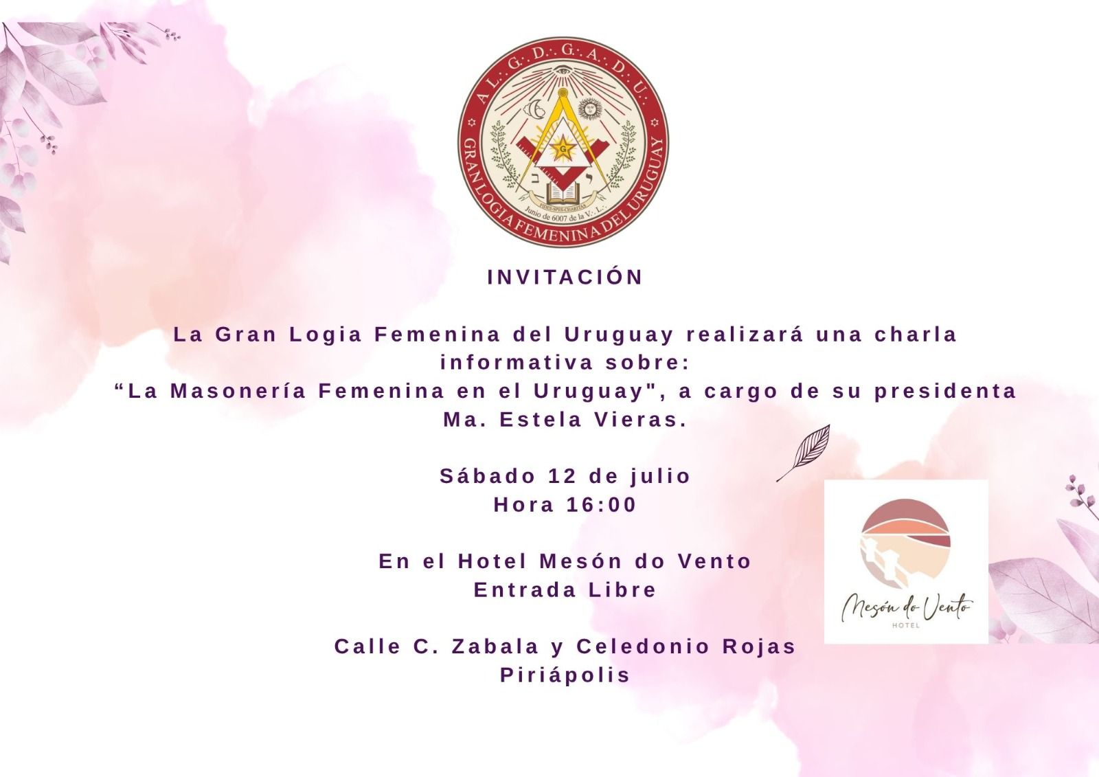 CCharla sobre la Masonería Femenina en Piriápolis; sábado 12 de julio en el hotel Mesón do Vento; entrada libre. Este sábado 12 de julio, la Gran Logia Femenina del Uruguay invita a la comunidad a una charla informativa sobre “La Masonería Femenina en el Uruguay”. La actividad estará a cargo de su presidenta, Maestra Estela Vieras, quien ofrecerá una mirada sobre el papel de la mujer en la masonería y su evolución en el país. El encuentro se realizará a las 16:00 horas en el Hotel Mesón do Vento, ubicado en la intersección de las calles C. Zabala y Celedonio Rojas, Piriápolis. La entrada es libre y abierta a todo público. La iniciativa busca promover el conocimiento sobre esta organización y fomentar espacios de diálogo sobre su impacto social y cultural.