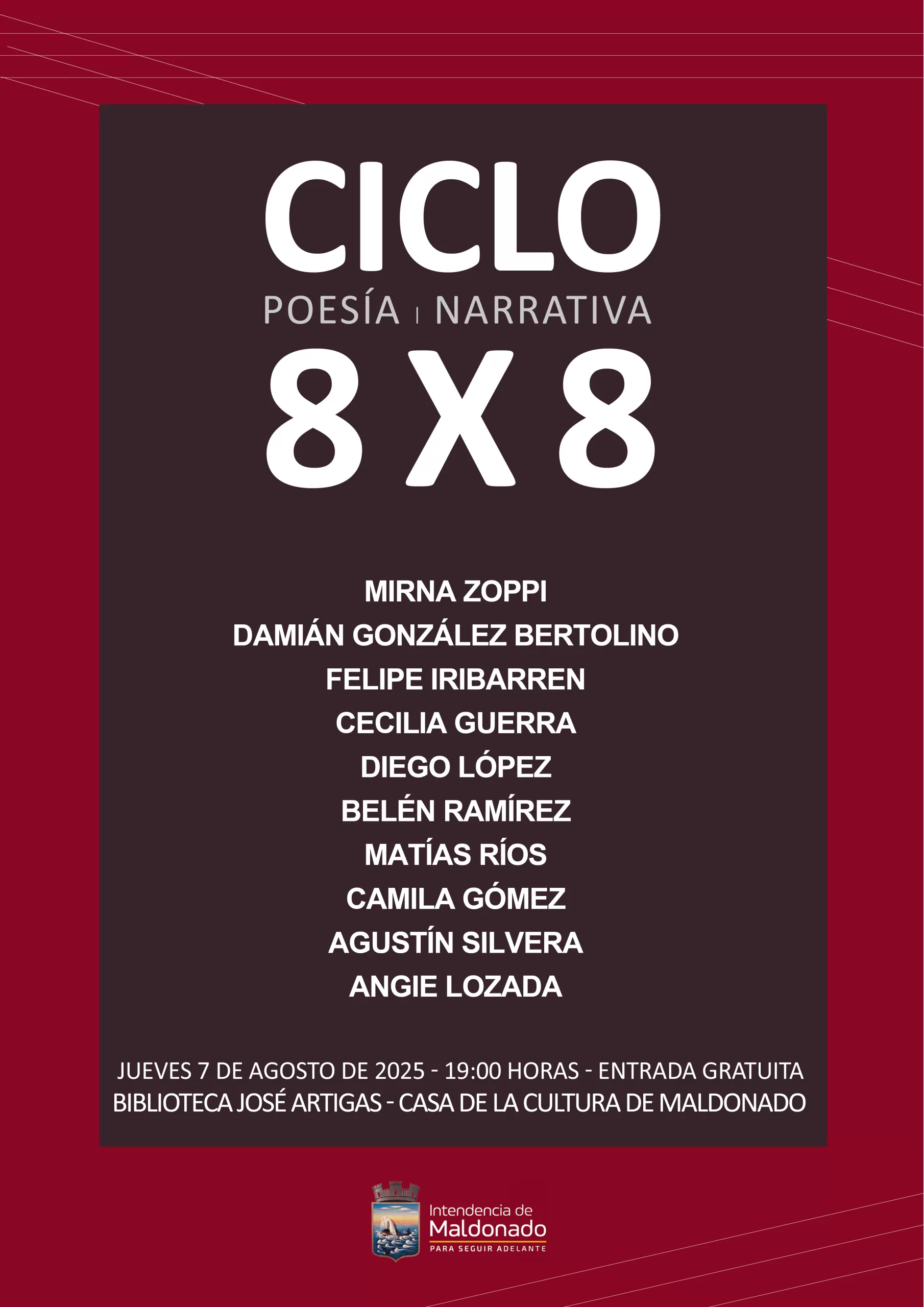 Ciclo 8X8: el 7 de agosto se realizará el encuentro de poesía y narrativa en la Casa de la Cultura de Maldonado. La cita será a las 19 horas de este jueves en las instalaciones de la Biblioteca Departamental José Artigas que se localiza en Rafael Pérez del Puerto, entre Sarandí y Román Guerra. Se podrá ingresar en forma libre y gratuita.