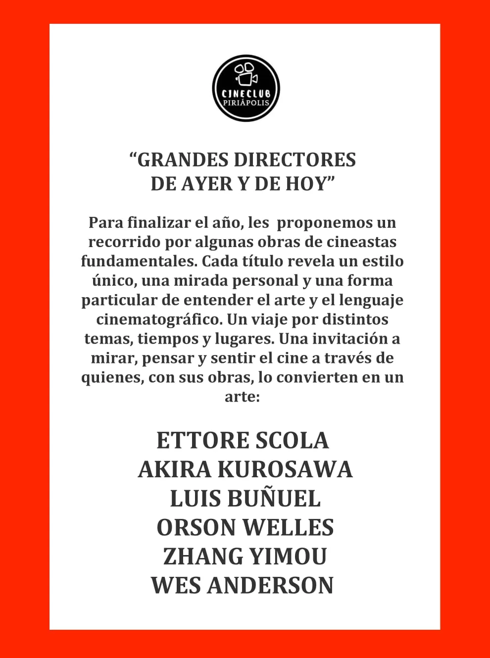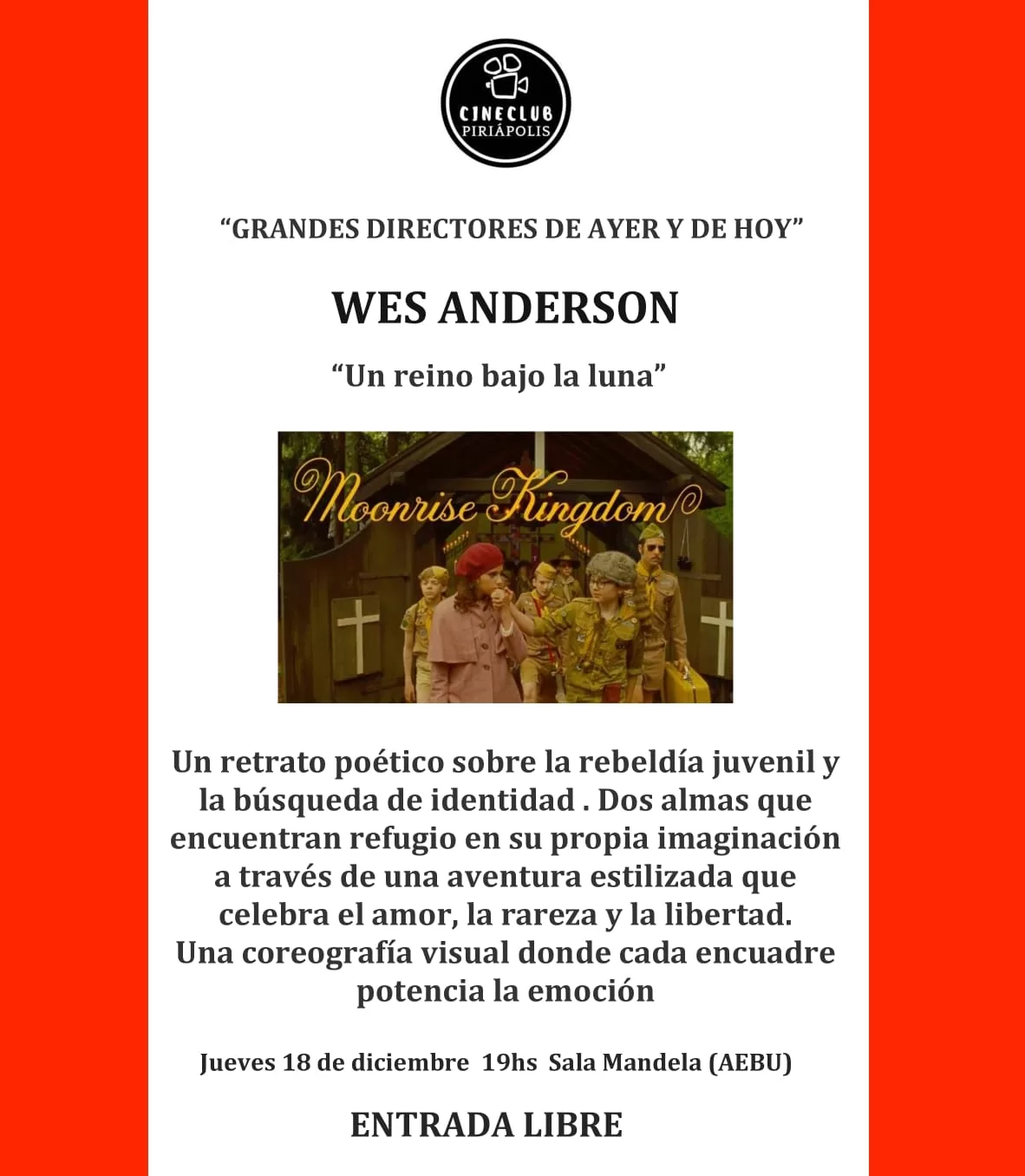 El Cineclub Piriápolis culmina su ciclo 2025 con una función especial este jueves 18 de diciembre a las 19:00 horas en la Sala Nelson Mandela de AEBU, celebrando un año de intensa actividad cultural que incluyó la proyección de 36 películas organizadas en 9 ciclos temáticos, vistas por 1700 espectadores. La última función estará dedicada al director Wes Anderson, con la exhibición de su film Un reino bajo la luna, en el marco del ciclo “Grandes Directores de Ayer y de Hoy”, que también incluyó obras de Ettore Scola, Akira Kurosawa, Luis Buñuel, Orson Welles y Zhang Yimou.