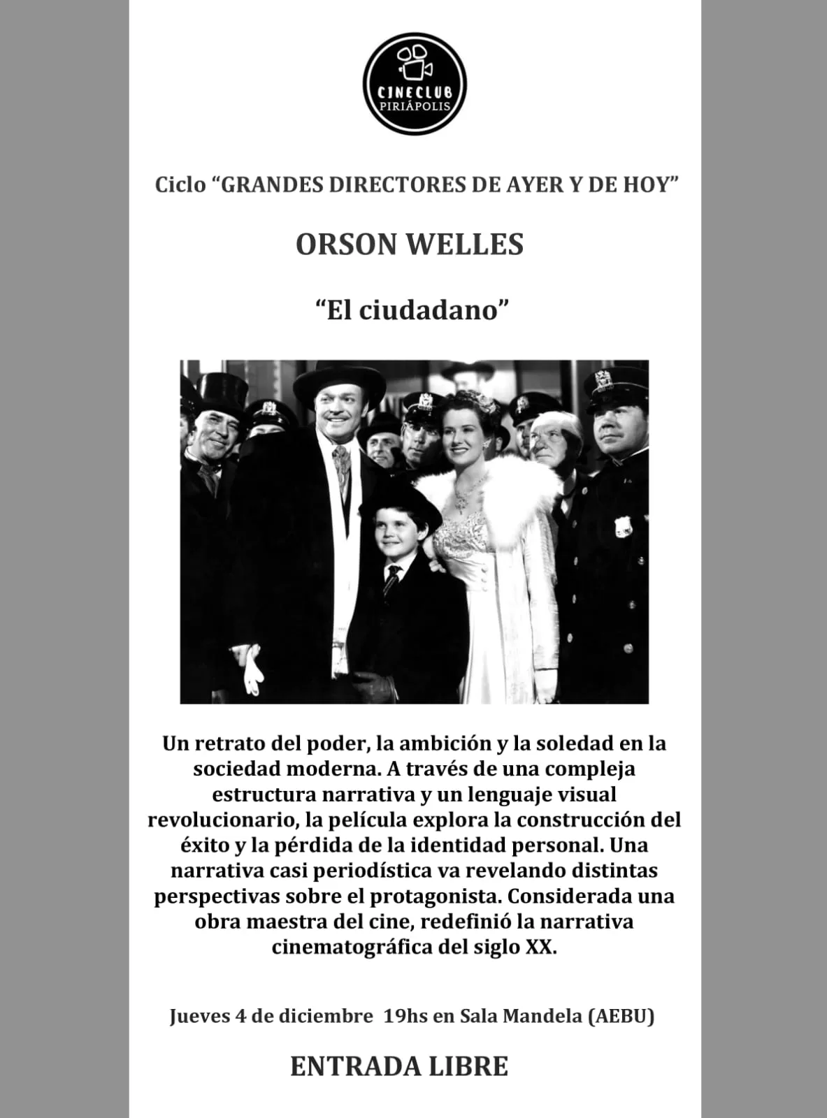 Cineclub Piriápolis presenta: “El ciudadano” de Orson Welles; jueves 4 en sala Mandela de AEBU. Este jueves 4 de diciembre a las 19:00 horas, Cineclub Piriápolis invita a disfrutar de una nueva función de cine gratuito en el marco del ciclo “Grandes Directores de Ayer y de Hoy”, con la proyección de la emblemática película “El ciudadano” (Citizen Kane) del reconocido director Orson Welles.