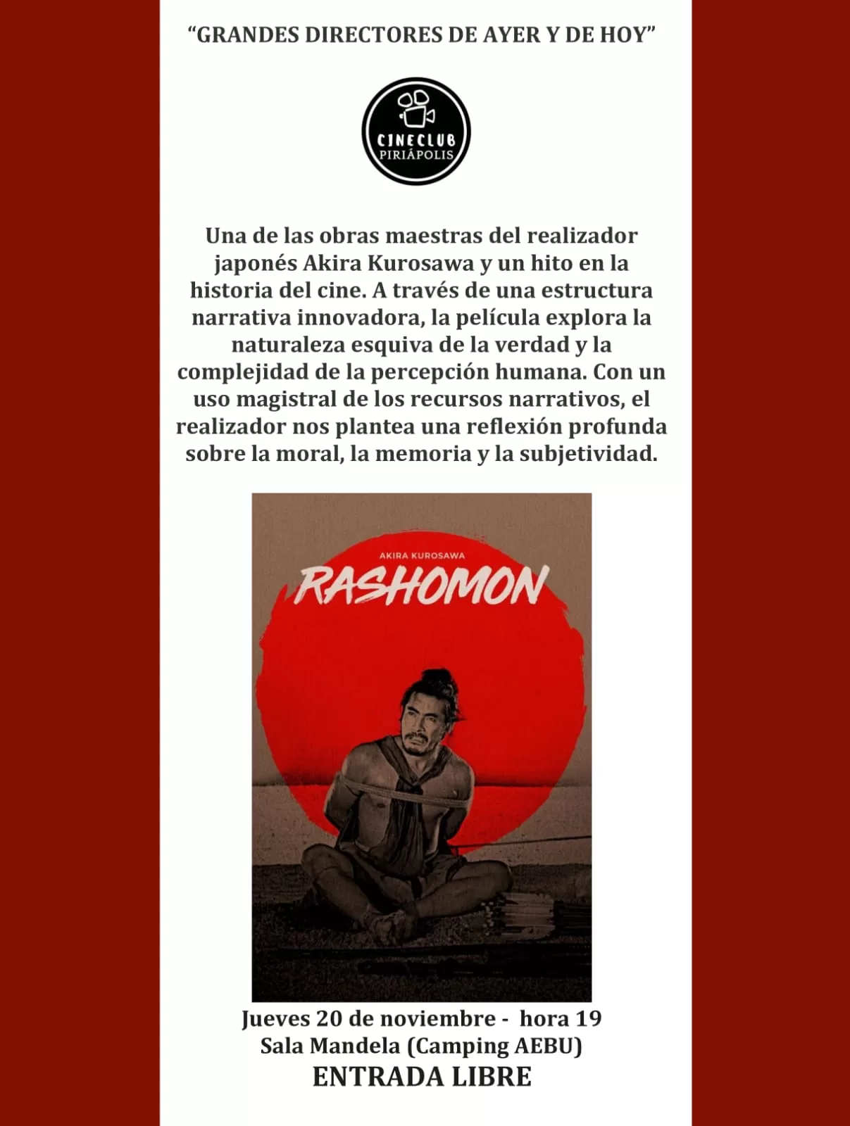 Cineclub Piriápolis presenta “Rashomon” de Akira Kurosawa; jueves 20 en sala Mandela de Aebu. Prosiguiendo con el último ciclo del año “Grandes Directores de Ayer y de Hoy”, Cineclub Piriápolis invita a disfrutar de una obra fundamental del cine mundial: “Rashomon”, del realizador japonés Akira Kurosawa. La función será el jueves 20 de noviembre a las 19:00 horas, en Sala Mandela (Camping AEBU, Piriápolis), con entrada libre.