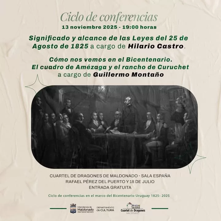 Conferencias por el Bicentenario a cargo de Hilario Castro y Guillermo Montaño; este jueves en el Cuartel de Dragones. Este jueves 13 de noviembre, a las 19:00 horas, la Sala España del Museo Didáctico Artiguista será escenario de una nueva instancia de reflexión en el marco del Bicentenario de los Hechos Históricos de 1825. La actividad, organizada por la Intendencia de Maldonado a través de su Departamento de Cultura, propone un ciclo de conferencias abierto a todo público, con entrada libre y gratuita.