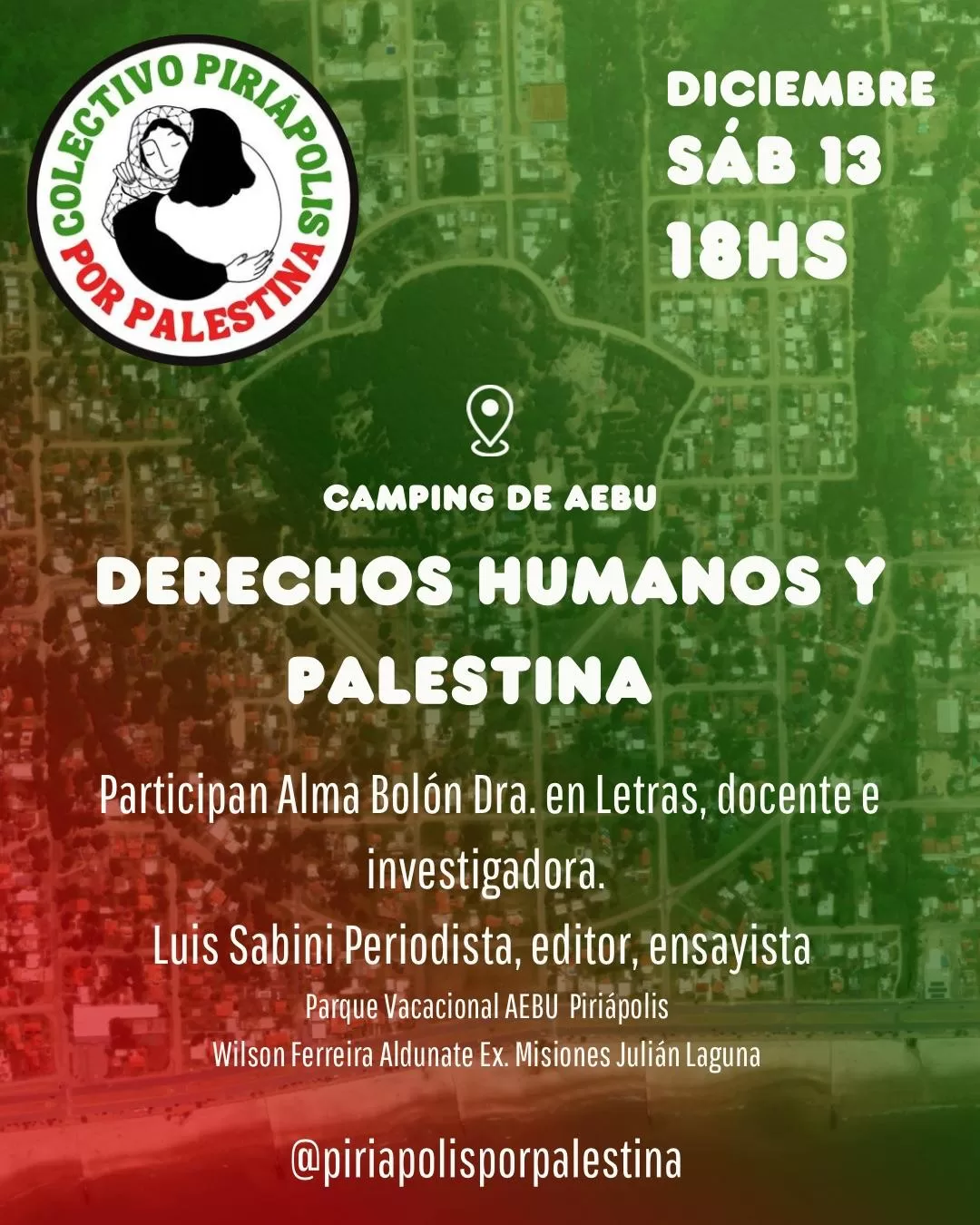 Conversatorio sobre Palestina y derechos humanos este sábado en AEBU Piriápolis. Este sábado 13 de diciembre a las 18:00 horas, el Colectivo Piriápolis por Palestina invita a participar en un conversatorio abierto sobre la historia del pueblo palestino, la implicancia de Uruguay en la creación del Estado de Israel y la actual situación en Gaza, en el marco de una jornada de reflexión sobre los derechos humanos.