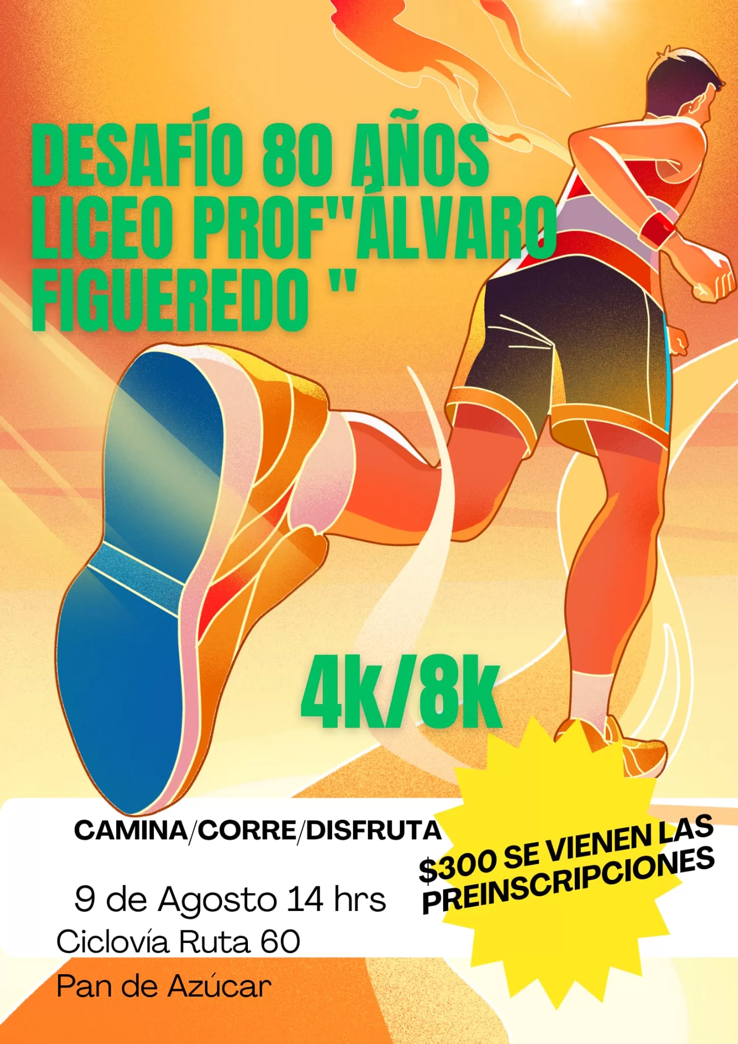 Correcaminata 8K/4K celebra 80 años del Liceo “Álvaro Figueredo” en Pan de Azúcar. El próximo 9 de agosto, desde las 14:00 horas, se realizará una correcaminata 8K/4K en la ciclovía de Ruta 60, en Pan de Azúcar, con motivo de los 80 años del Liceo Profesor Álvaro Figueredo.