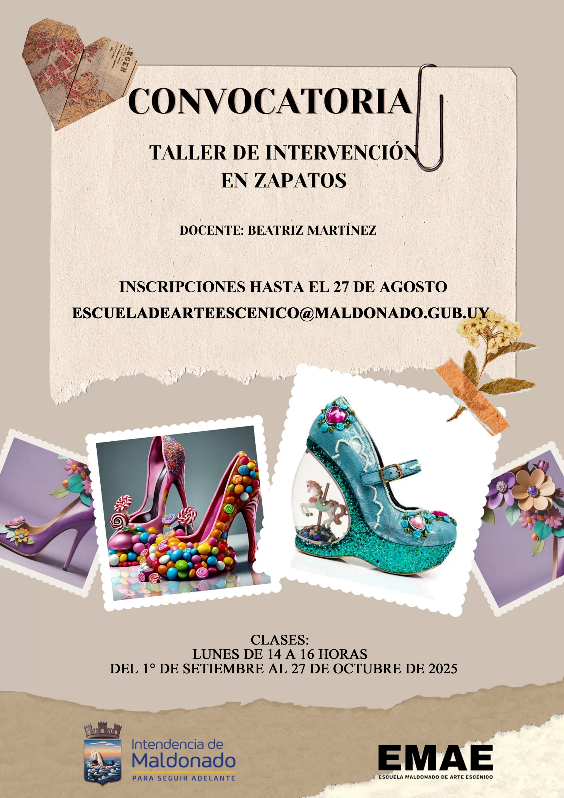 Departamento de Cultura convoca a interesados en asistir al taller de intervención de zapatos. La propuesta vuelve a presentarse dentro del plan educativo de la Escuela de Arte Escénico (EMAE) brindando la experiencia de aproximación al arte, a través de la transformación del objeto, a todos los interesados mayores de 16 años.