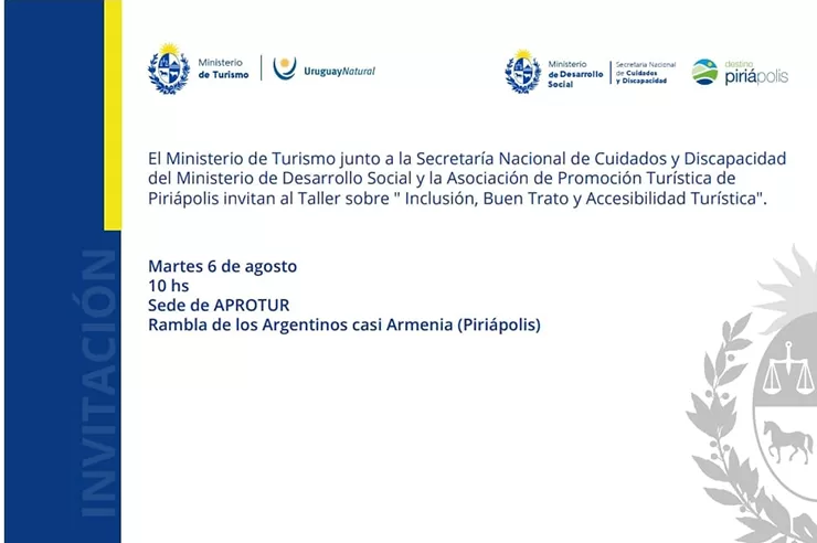 Dictan taller de inclusión, buen trato y accesibilidad turística; este martes en Piriápolis, miércoles en Punta del Este. El Ministerio de Turismo, junto a la Secretaría Nacional de Cuidados y Discapacidad del MIDES y la Dirección General de Turismo de Maldonado, invita a participar de estas instancias que se desarrollarán el martes 6 de agosto en la sala Aprotur de Piriápolis y el miércoles 7 en el Municipio de Punta del Este.