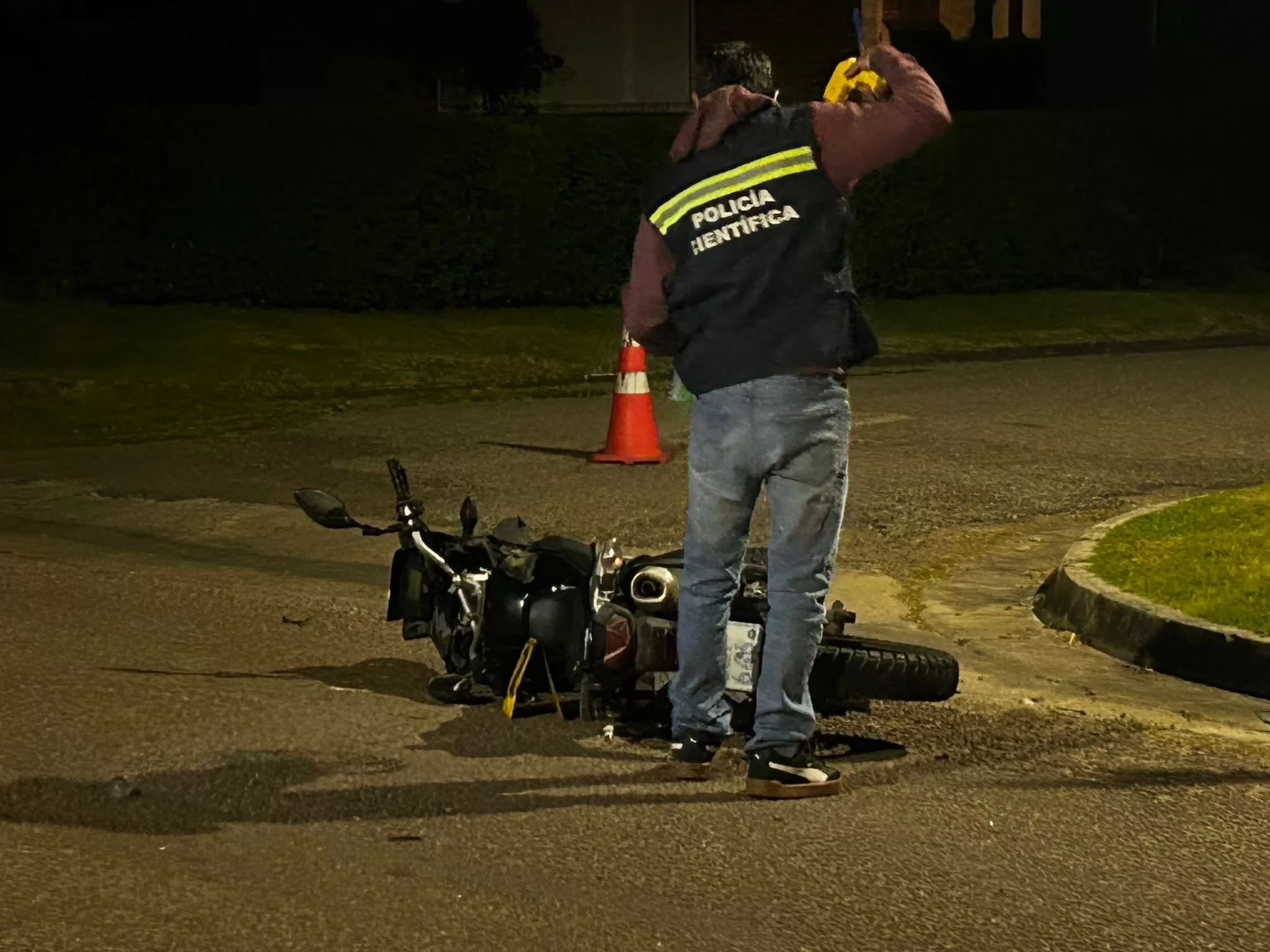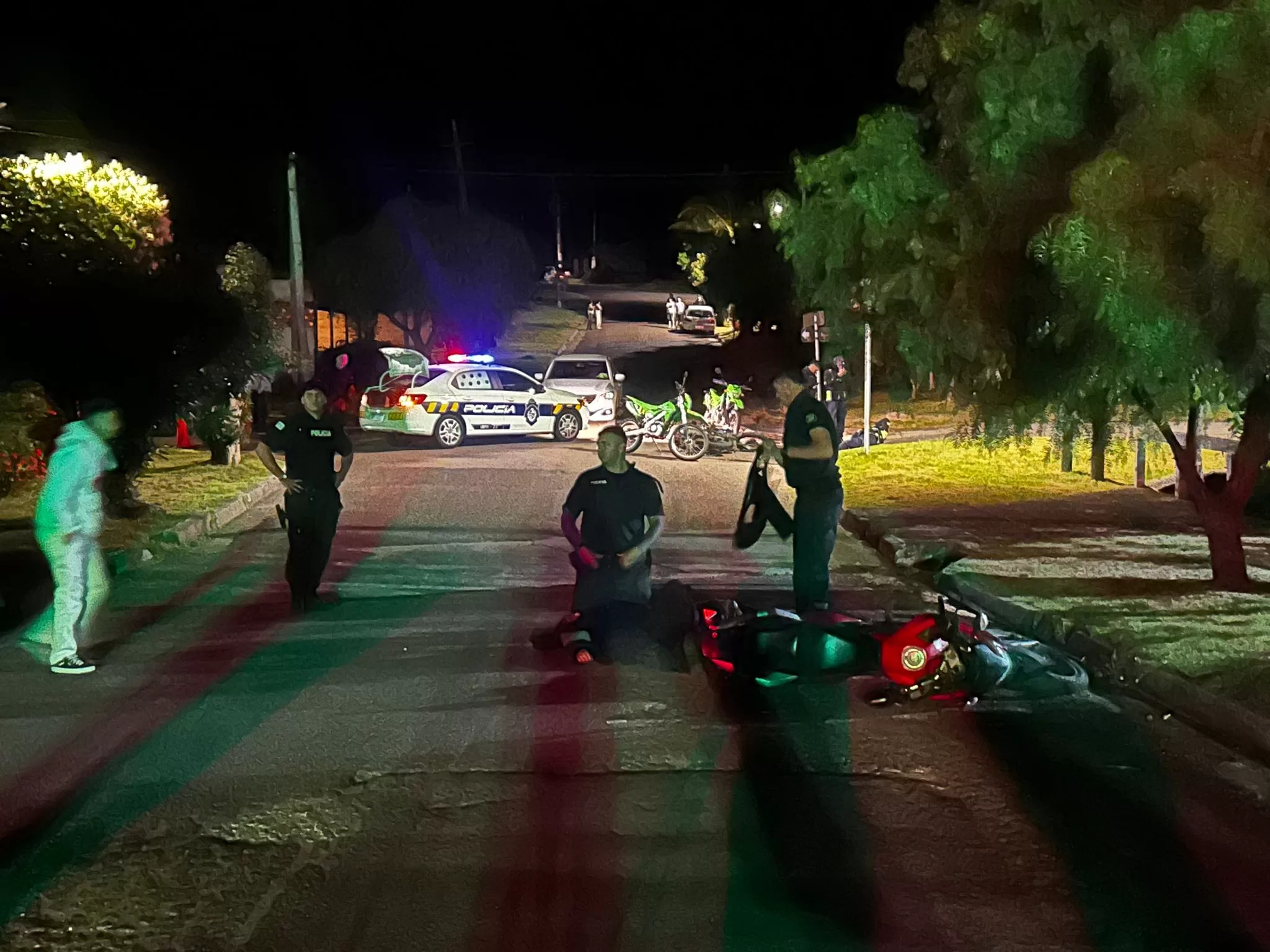 En el marco del operativo, dos motos del Programa de Alta Dedicación Operativa (PADO) colisionaron en la esquina de Sarmiento y Buenos Aires, a media cuadra de la vivienda siniestrada, cayendo ambos conductores al pavimento.