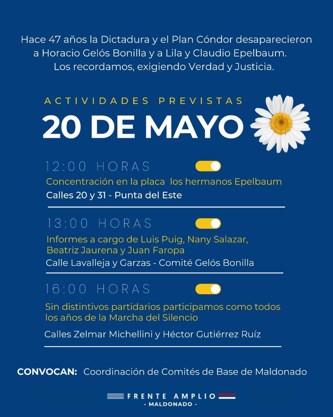 A partir de las 16:00, se realizará concentración sin distintivos partidarios en la marcha del silencio de la ciudad de Maldonado. Se parte de la esquina de Zelmar Michellini y Gutierrez Ruiz,