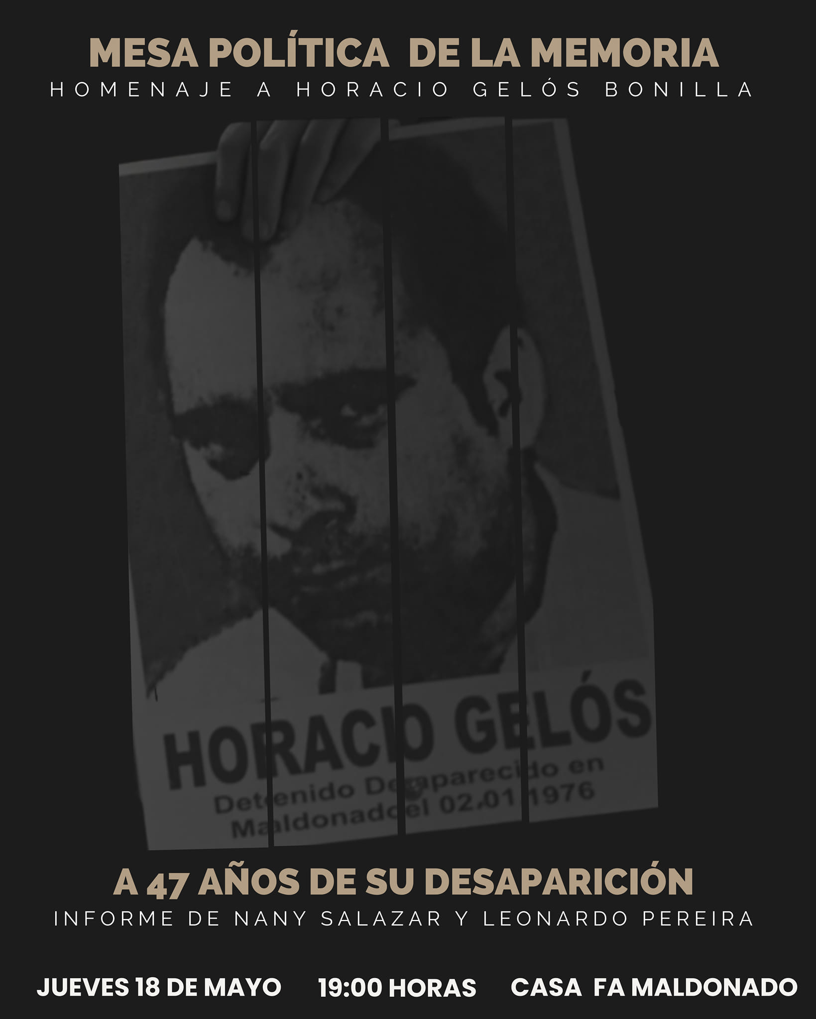Este jueves 18 de mayo, se rendirá homenaje a Horacio Gelós Bonilla tras 47 años de su desaparición. Se dará un informe de su caso a cargo de Nany Salazar y Leonardo Pereira. A las 19hs, en Casa del Frente Amplio Maldonado (Batlle y Ordóñez, esquina Lavalleja), en instancia abierta.