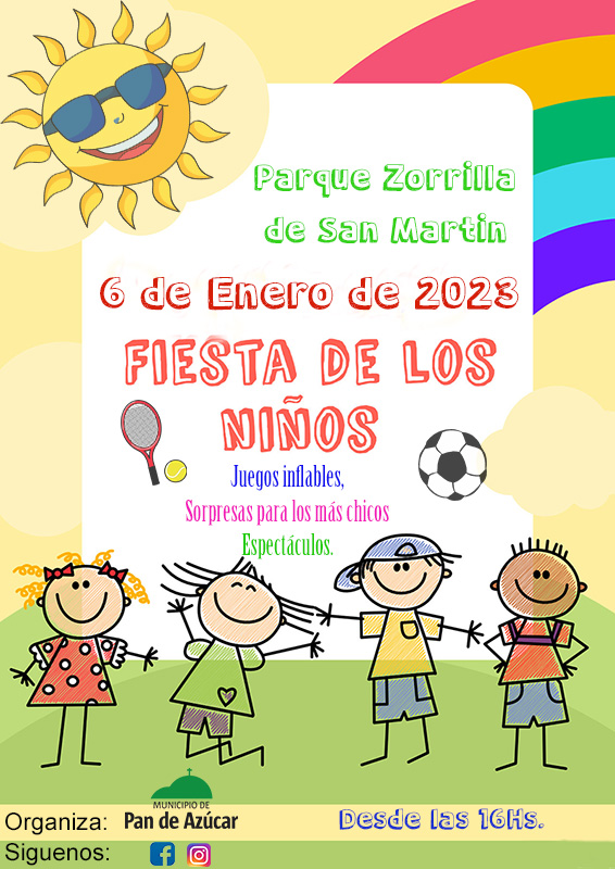 Fiesta de los Niños en Pan de Azúcar: viernes 6 de enero en el Parque Zorrilla. En el marco del feriado Reyes, el Municipio de Pan de Azúcar invita a la población a la Fiesta de los Niños que se realizará el viernes, 6 de enero de 2023, a partir de la hora 16:00, en el parque Zorrilla de San Martín. Juegos inflables, sorpresas para los mas chicos, espectáculos. Entrada libre y gratuita!