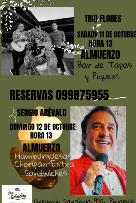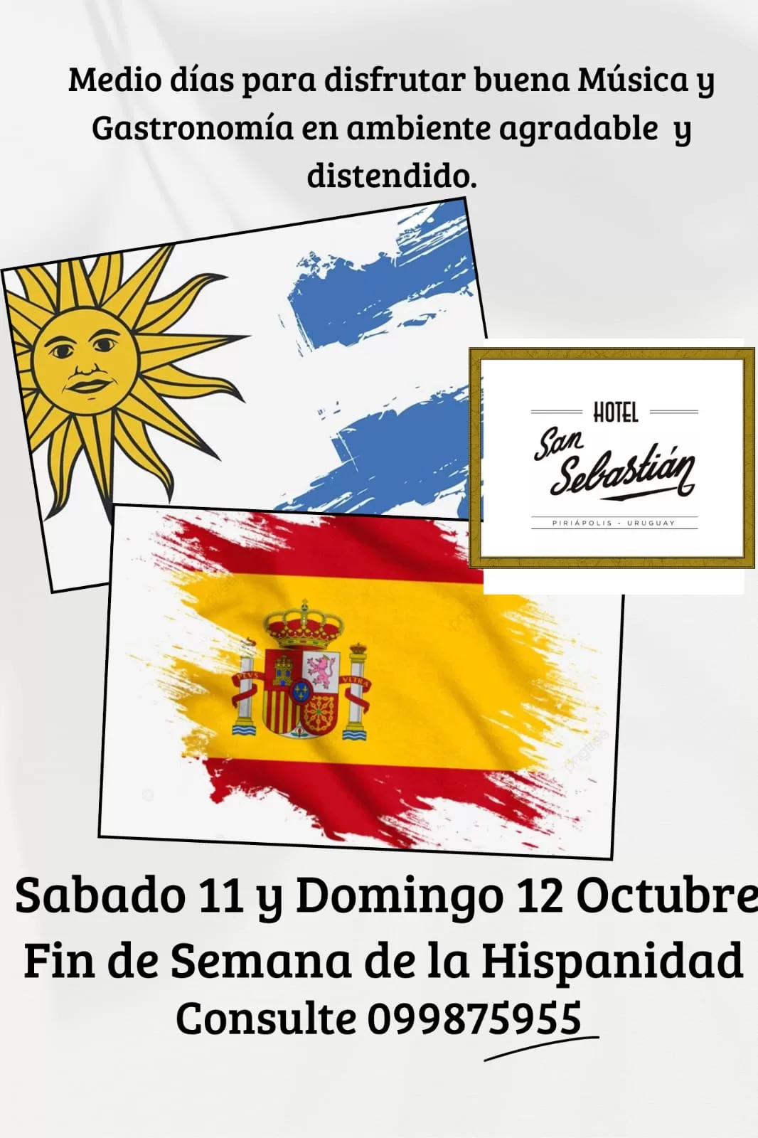 Fin de Semana de la Hispanidad en Piriápolis: mediodías música y gastronomía en Hotel San Sebastián. Este sábado 11 y domingo 12 de octubre, el Hotel San Sebastián celebra el fin de Semana de la Hispanidad, con una propuesta que combina música en vivo y gastronomía en un ambiente distendido, abierto al público, con la presentación de reconocidos artistas: Trío Flores y Sergio Arévalo. Las reservas pueden realizarse al 099 875 955.