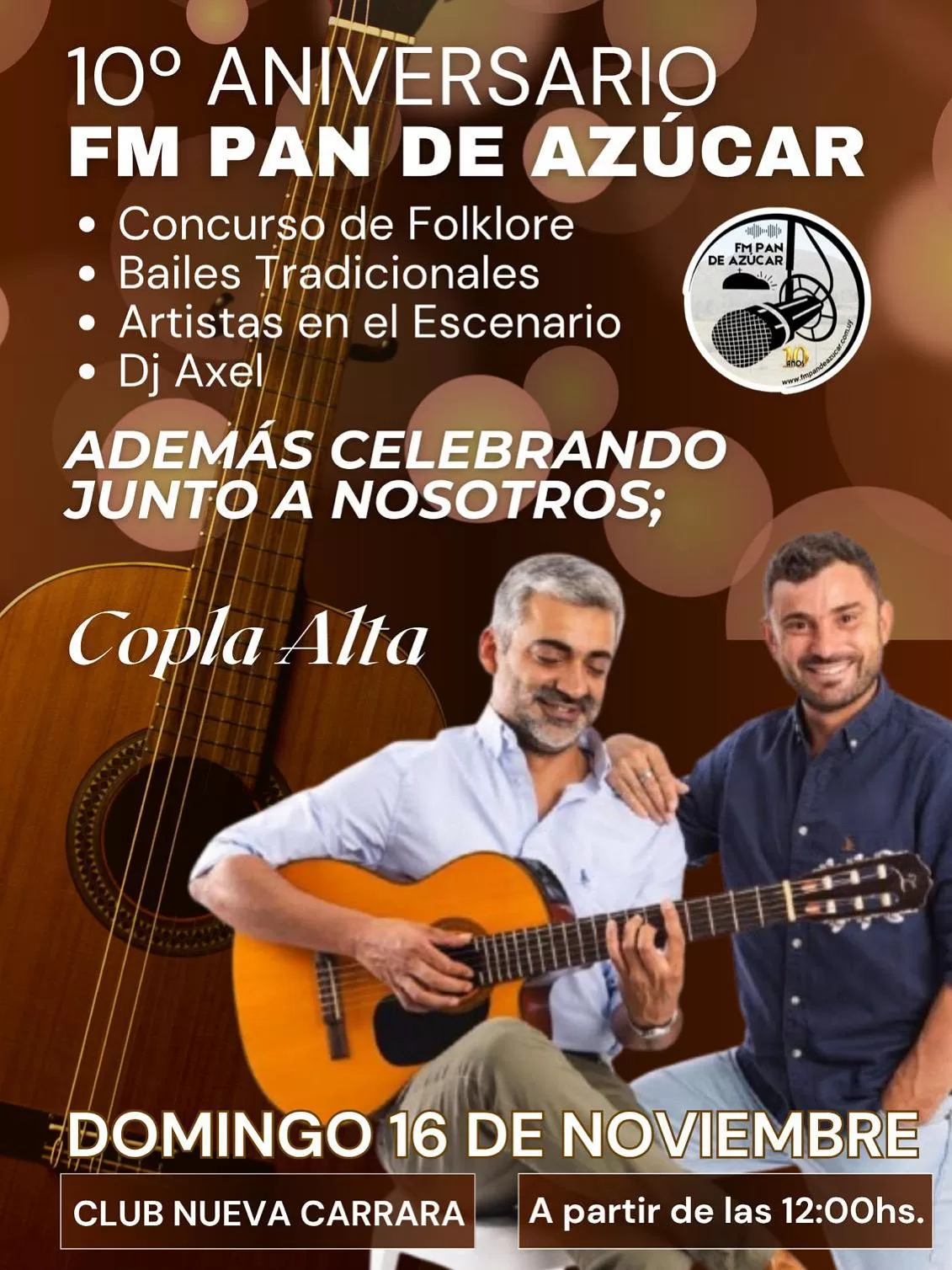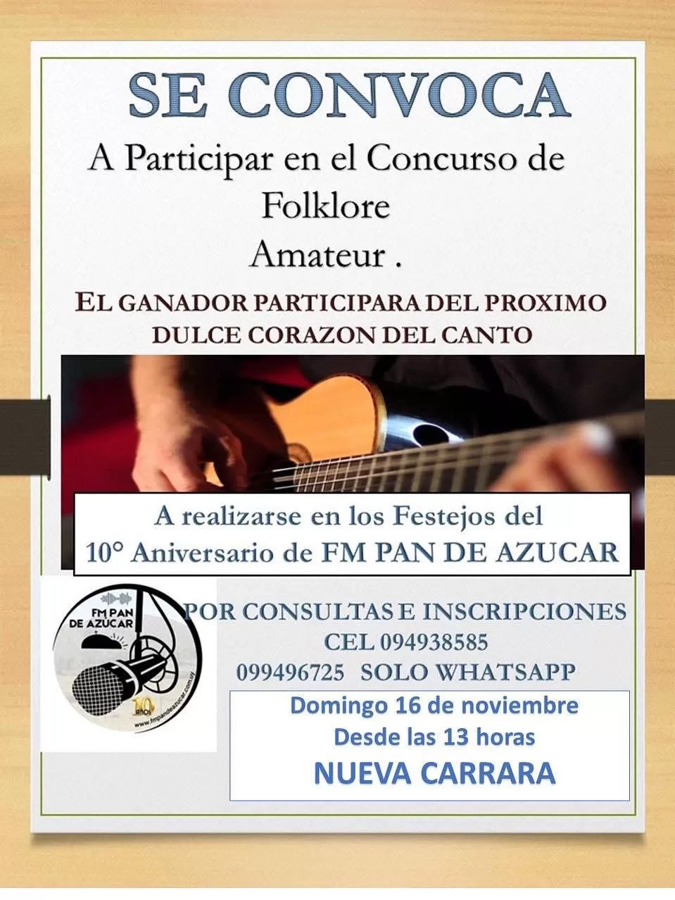 FM Pan de Azúcar celebra su 10º aniversario con gran fiesta y concurso de folklore amateur; inscripciones abiertas. En el marco de los festejos por su décimo aniversario, FM Pan de Azúcar organiza un certamen de folklore amateur que se desarrollará el domingo 16 de noviembre en Nueva Carrara, Pan de Azúcar. La convocatoria está dirigida a solistas, dúos y conjuntos mayores de 14 años, sin grabaciones realizadas, que deseen participar interpretando música folklórica.