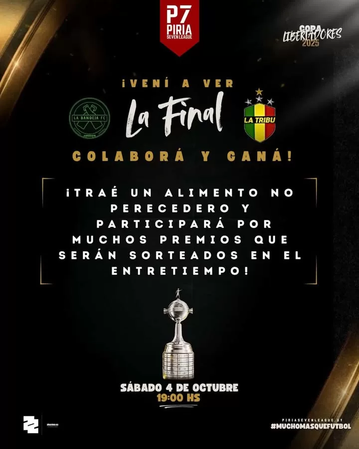 Este sábado 4 de octubre, a las 19:00 horas, el Complejo Puro Fútbol será escenario de una jornada que promete emoción, comunidad y compromiso social con la gran final de la 1ª Copa Libertadores de la Piria Seven League. Los equipos La Bandeja y La Tribu vuelven a encontrarse en una definición que despierta expectativas entre jugadores, vecinos y seguidores del fútbol barrial. Como cada sábado, el evento reunirá a familias, amigos y aficionados, pero esta vez con un componente especial: el aporte solidario de todos los asistentes.