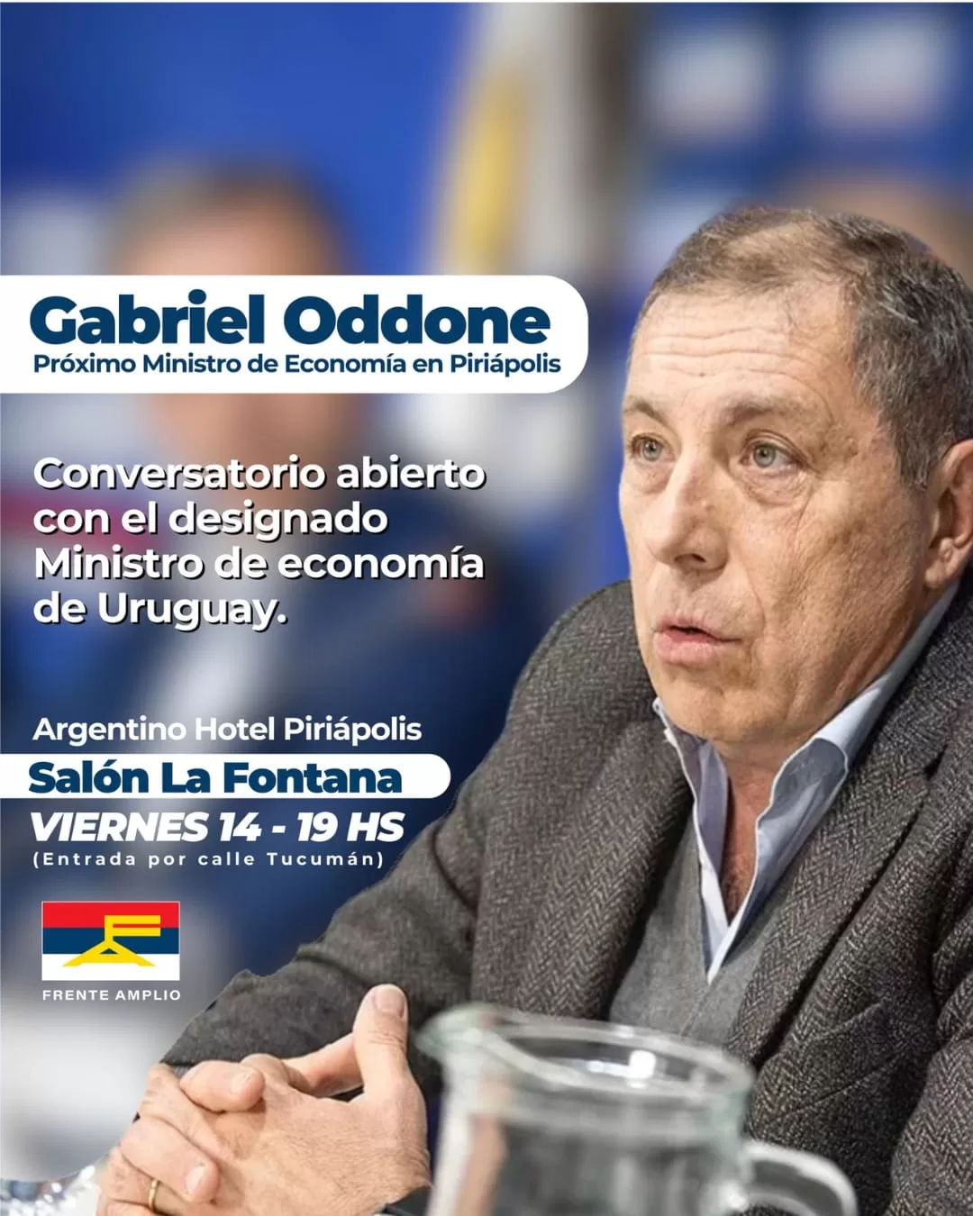 Gabriel Oddone, futuro ministro de Economía, estará el viernes en Piriápolis; hora 19:00 en el salón La Fontana. El próximo viernes 14 de febrero el designado ministro de Economía y Finanzas por el gobierno electo, economista Gabriel Oddone, estará en Piriápolis, se informó desde el comité Eduardo Mondello de Piriápolis.