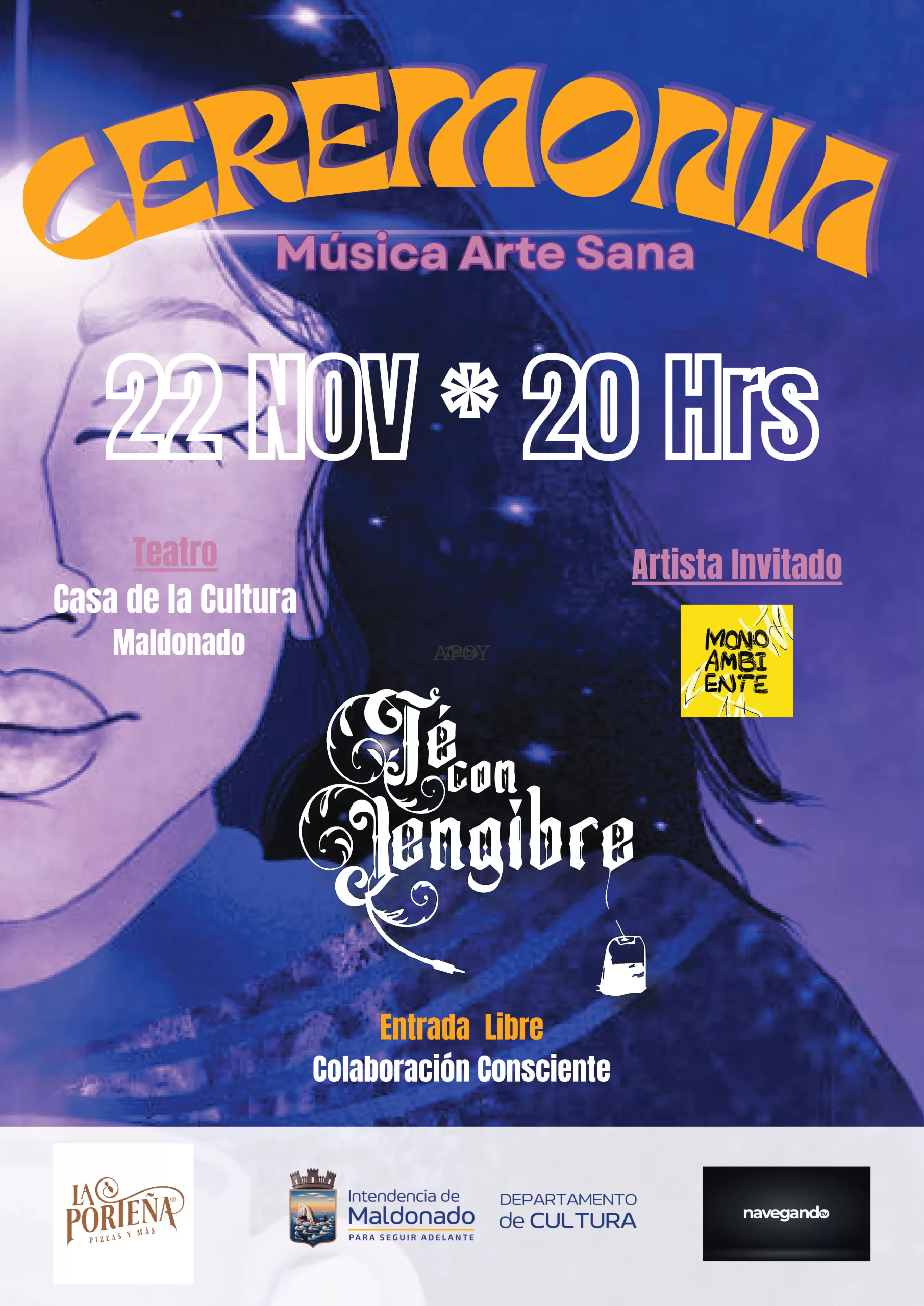 Ceremonia es unespectáculo que se llevará a cabo en el marco del proyecto “Té con Jengibre”: música de autor que combina música, teatro y arte en general. El dúo artístico está conformado por Gonzalo Castillo y Christian Antelo Silva.