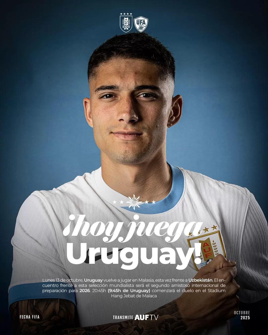 Hoy juega la celeste! Uruguay vs. Uzbekistán en Malasia; amistoso internacional hora 09:45. Este lunes 13 de octubre, la selección uruguaya enfrentará a Uzbekistán en un amistoso internacional por Fecha FIFA, como parte de su preparación rumbo al Mundial 2026. El encuentro se disputará en el Stadium Hang Jebat, en la ciudad de Malaca, Malasia.