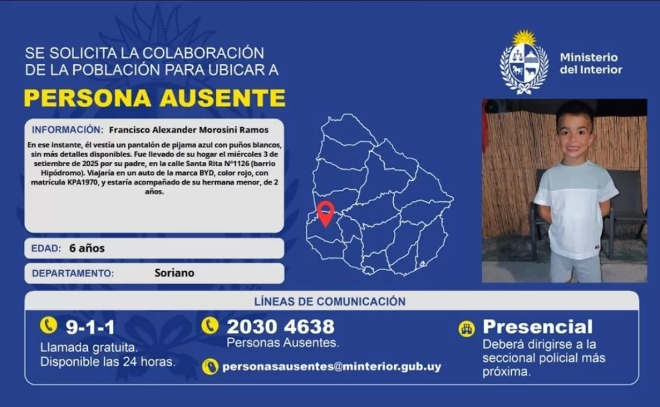 Hallaron sin vida a los menores desaparecidos en Soriano. El Ministerio del Interior confirmó este viernes 5 de setiembre el hallazgo sin vida de los niños Francisco Alexander Morosini Ramos (6 años) y Alfonsina Morosini Ramos (2 años), quienes eran intensamente buscados desde su desaparición en el departamento de Soriano. También fue encontrado el cuerpo de Andrés Morosini Rechoppa (28 años), señalado como responsable del rapto de los menores.