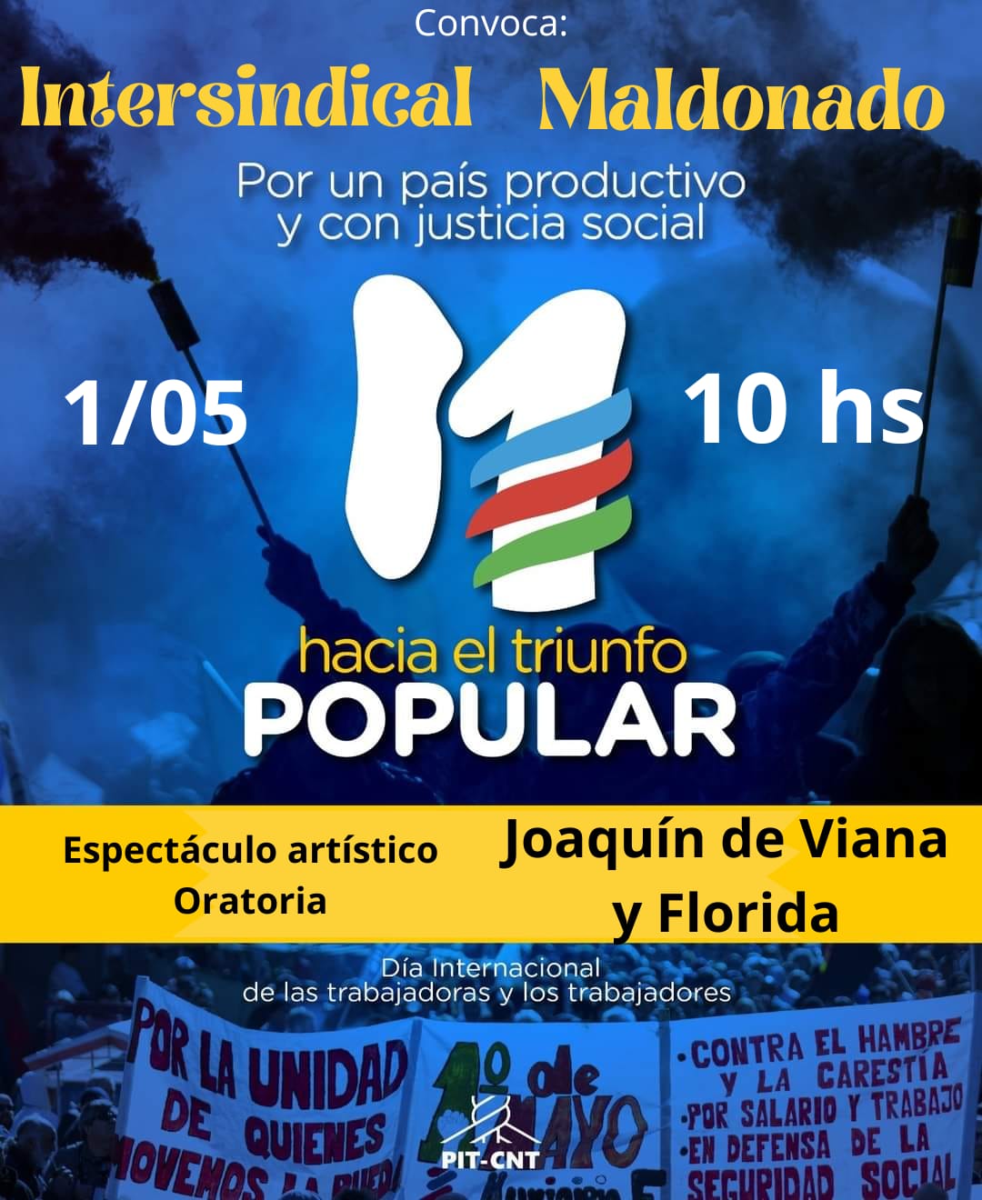 Intersindical Maldonado convoca al acto del 1 de mayo: por un país productivo y con justicia social hacia el triunfo popular. Será a la hora 10:00 de este miércoles, 1 de mayo de 2024, en Joaquín de Viana y Florida, en la capital fernandina. Espectáculos artísticos, oratoria.