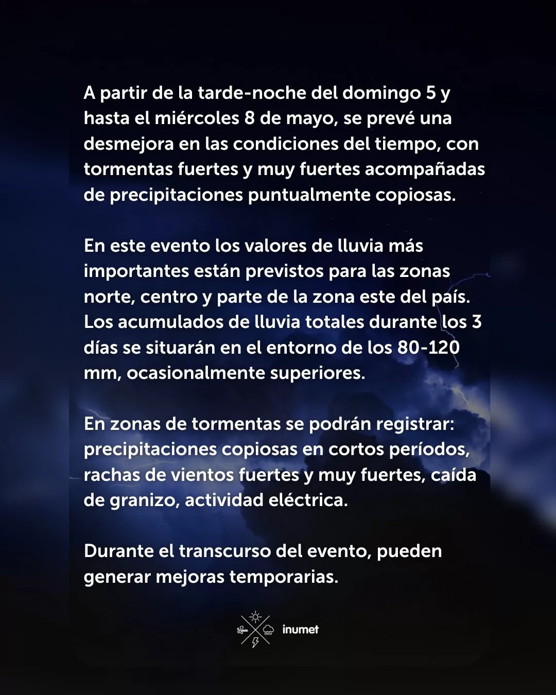 Inumet advierte por tormentas muy fuertes y precipitaciones copiosas desde la noche del domingo y hasta el miércoles inclusive. El Inumet emitió un aviso a la población por una desmejora en el estado del tiempo que se extenderá desde la tarde/noche del domingo 5 y hasta el miércoles 8 de mayo inclusive con tormentas muy fuertes y lluvias intensas que afectarán principalmente a las zonas norte, centro y parte del este del país.