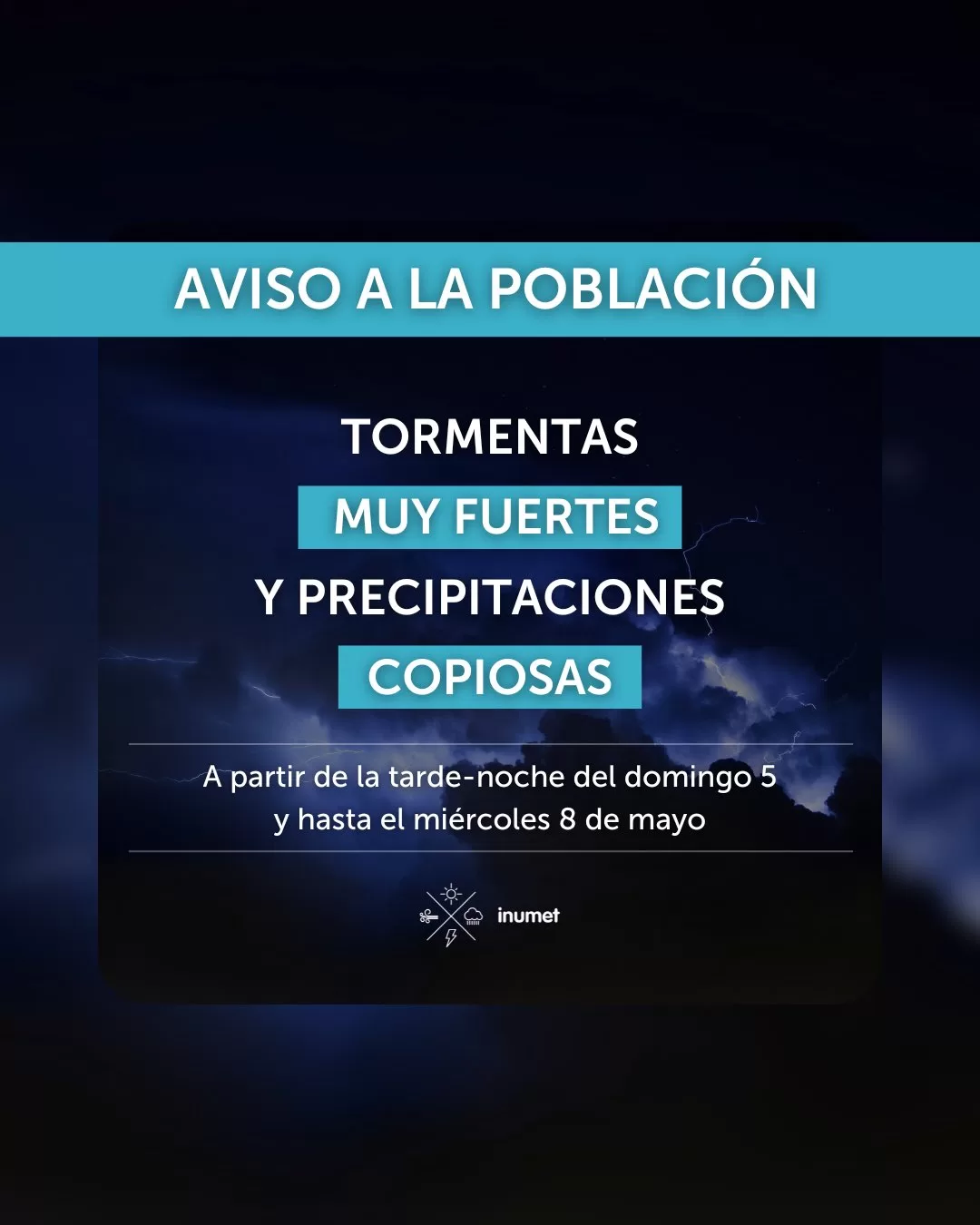 Inumet advierte por tormentas muy fuertes y precipitaciones copiosas desde la noche del domingo y hasta el miércoles inclusive. El Inumet emitió un aviso a la población por una desmejora en el estado del tiempo que se extenderá desde la tarde/noche del domingo 5 y hasta el miércoles 8 de mayo inclusive con tormentas muy fuertes y lluvias intensas que afectarán principalmente a las zonas norte, centro y parte del este del país.
