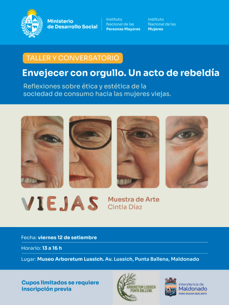 Inmayores e Inmujeres (MIDES), con el apoyo de la Intendencia del Maldonado y Arboretum Lussich invitan al evento: «Envejecer con orgullo. Un acto de rebeldía» en el marco de la muestra artística «Viejas» de Cintia Díaz.