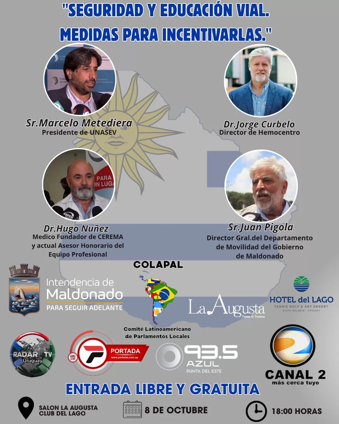 El evento contará con la participación de destacados referentes en materia de movilidad, salud y seguridad vial. Disertarán el Sr. Marcelo Metediera, presidente de UNASEV; el Dr. Jorge Curbelo, director del Hemocentro; el Dr. Hugo Núñez, médico fundador de CEREMA y asesor honorario del Hemocentro; y el Sr. Juan Pigola, director general del Departamento de Movilidad de la Intendencia de Maldonado.