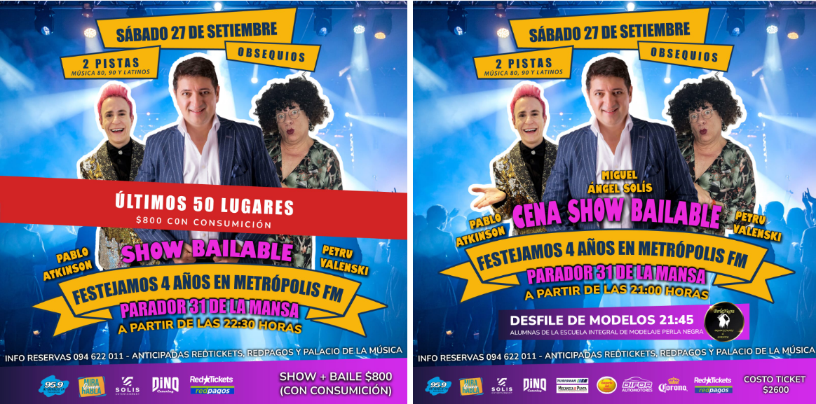Miguel Ángel Solís celebra 4 años en Metrópolis FM con cena show bailable en Parador 31 de la Mansa #PuntadelEste. Este sábado 27 de setiembre, desde las 21:00 horas, el Parador 31 de la Mansa será escenario de una noche inolvidable con motivo del 4.º aniversario de Miguel Ángel Solís en Metrópolis FM, que lo festeja con una cena show bailable, espectáculos en vivo, dos pistas musicales y desfile de moda.