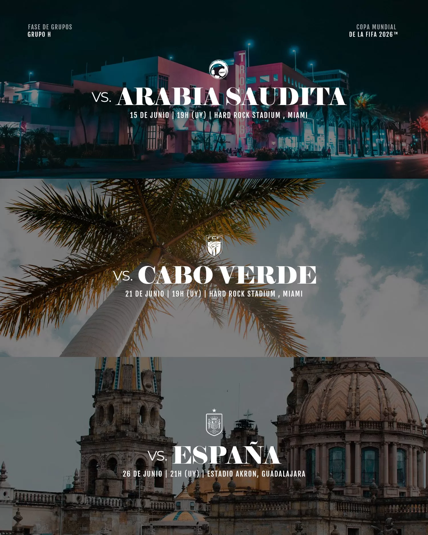 Uruguay integra el Grupo H junto a Arabia Saudita, Cabo Verde y España, y disputará sus dos primeros partidos en el Hard Rock Stadium de Miami, Estados Unidos, antes de viajar a México para cerrar la fase en el Estadio Akron de Guadalajara.