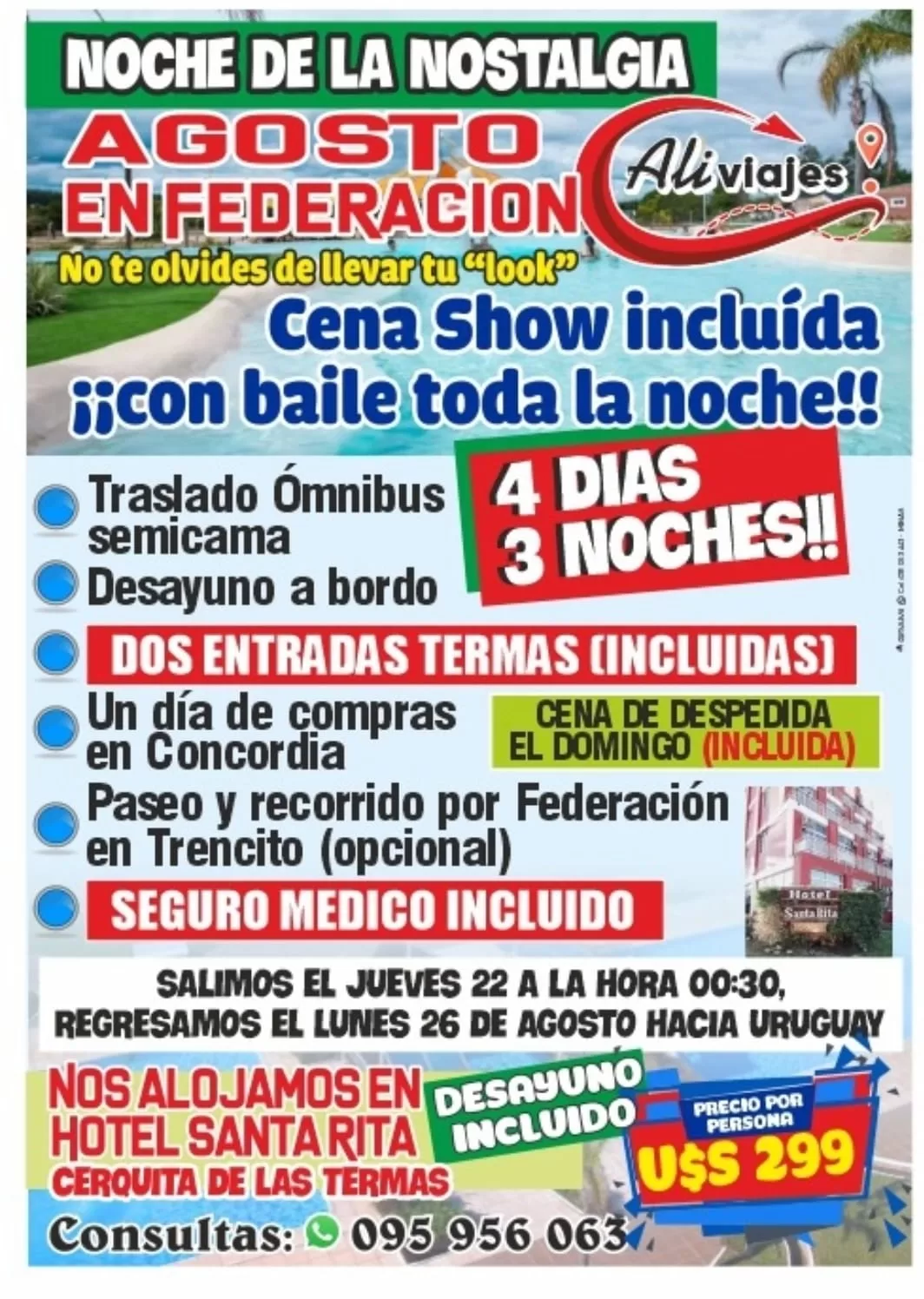 Noche de la Nostalgia en Termas de Federación: cuatro días con tres noches de hotel. 299 dólares y si mencionás este aviso obtenés un descuento especial Pan de Azúcar, Piriapolis y Maldonado!