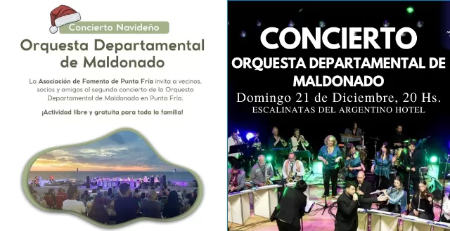 La Orquesta Departamental de Maldonado ofrecerá este fin de semana dos presentaciones especiales en Piriápolis, en el marco de sus tradicionales Conciertos Navideños, bajo la dirección musical del Maestro Alejandro Gorbea. Este sábado 20 de diciembre, a las 20 horas, la Orquesta se presentará en la Rambla de los Ingleses y Teodoro Vilardebó, Punta Fría, en un evento organizado por la Asociación de Fomento de Punta Fría, con el apoyo del Municipio de Piriápolis.