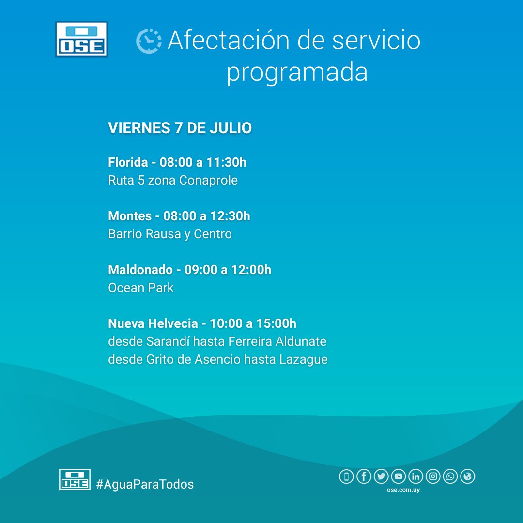 OSE comunica afectación del servicio de agua potable en balneario Ocean Park, jurisdicción del municipio de Piriápolis, por obras que se estarán realizando este viernes 7 de julio en el horario de 09:00 a 12:00.