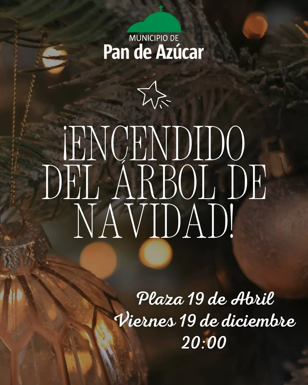 Autoridades del Municipio de Pan de Azúcar, resolvieron este jueves 11 de diciembre, modificar la fecha del encendido del árbol de Navidad en la ciudad, originalmente prevista para este viernes. La nueva fecha será el viernes 19 de diciembre a las 20:00 horas, en la Plaza 19 de Abril. La actividad forma parte de una serie de celebraciones organizadas por el Municipio, con el objetivo de compartir el espíritu navideño en comunidad. Foto portada archivo, meramente ilustrativa.