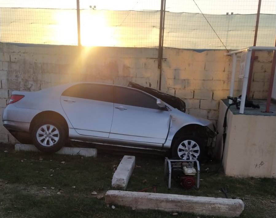 Pan de Azúcar: Siniestro de tránsito en parque Zorrilla. Bomberos del destacamento de Pan de Azúcar trabaja a esta hora para rescatar al conductor de un auto que quedó atrapado en el vehículo, luego de despistar y chocar contra mojones, quedando contra el muro del estadio municipal a metros de una cabina de personal de seguridad en el parque Zorrilla de San Martín.