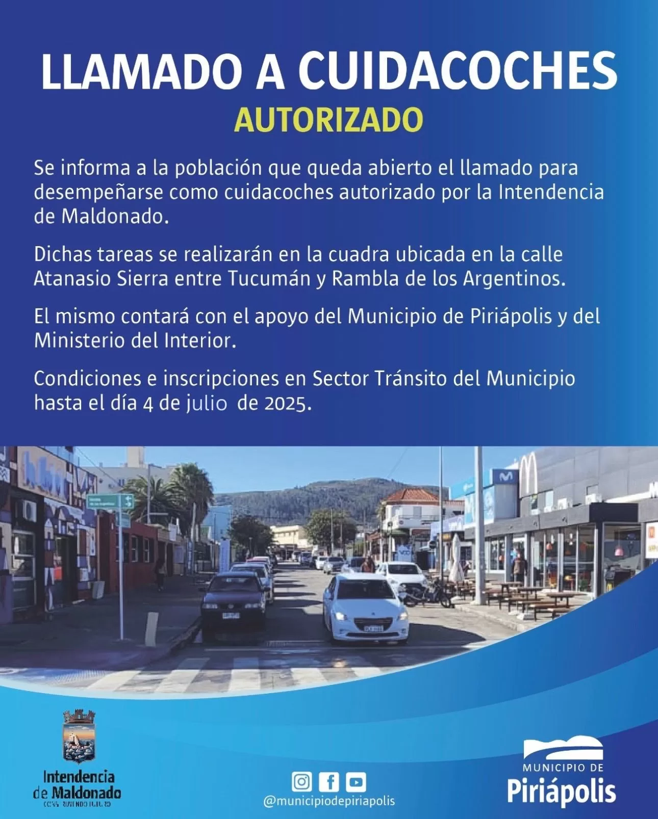 Piriápolis: abren llamado para desempeñarse como Cuidacoches autorizados por la Intendencia de Maldonado El Municipio de Piriápolis informa a la población que se encuentra abierto el llamado para desempeñarse como cuidacoches autorizado por la Intendencia de Maldonado. El mismo contraá con el apoyo del Municipio de Piriápolis y del Ministerio del Interior.