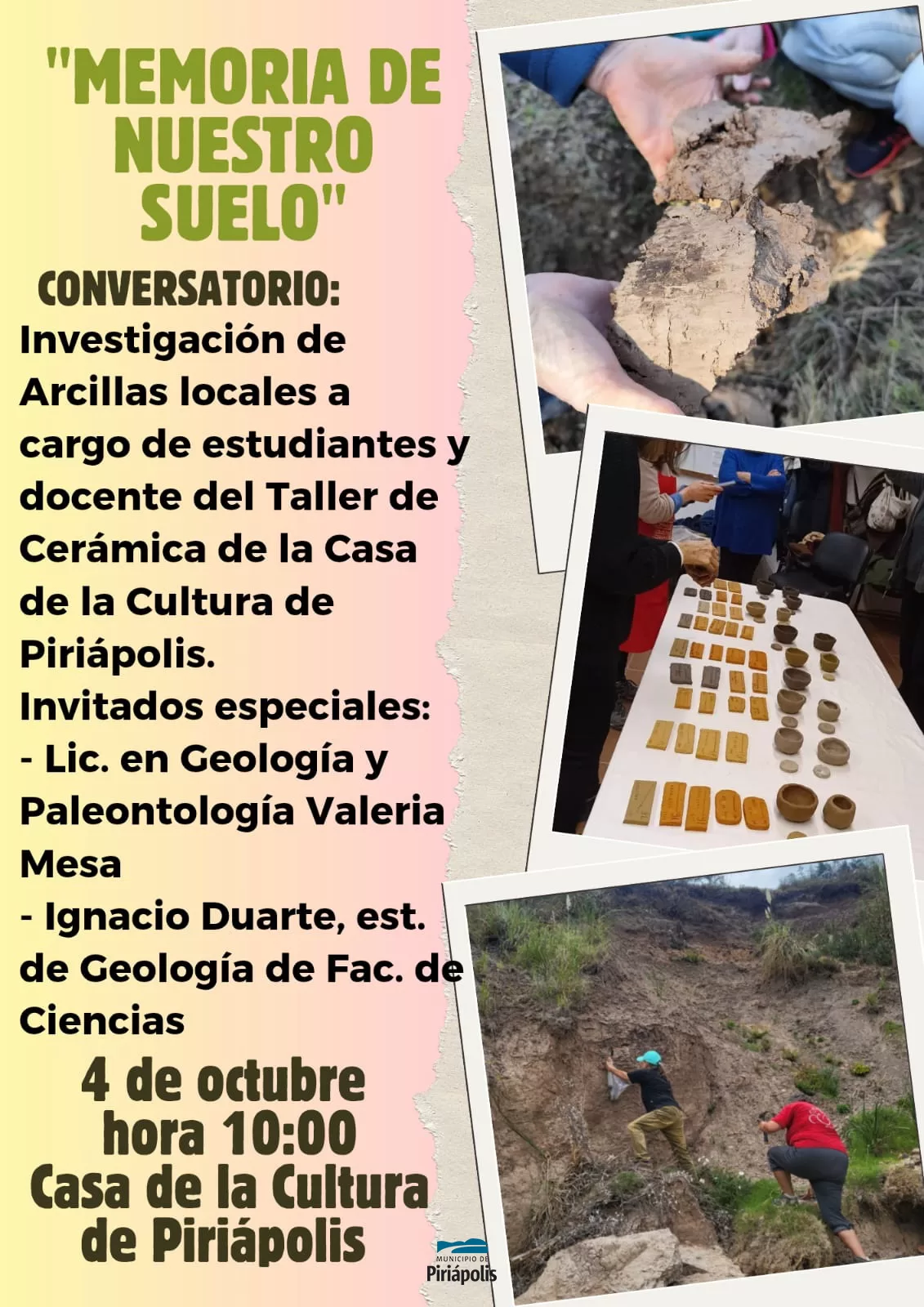 La jornada comenzará con el conversatorio Memoria de Nuestro Suelo, una instancia de intercambio sobre la investigación de arcillas locales realizada por estudiantes y docentes del Taller de Cerámica de la Casa de la Cultura. La actividad contará con la presencia de la Licenciada en Geología y Paleontología Valeria Mesa y del estudiante de Geología Ignacio Duarte, de la Facultad de Ciencias.