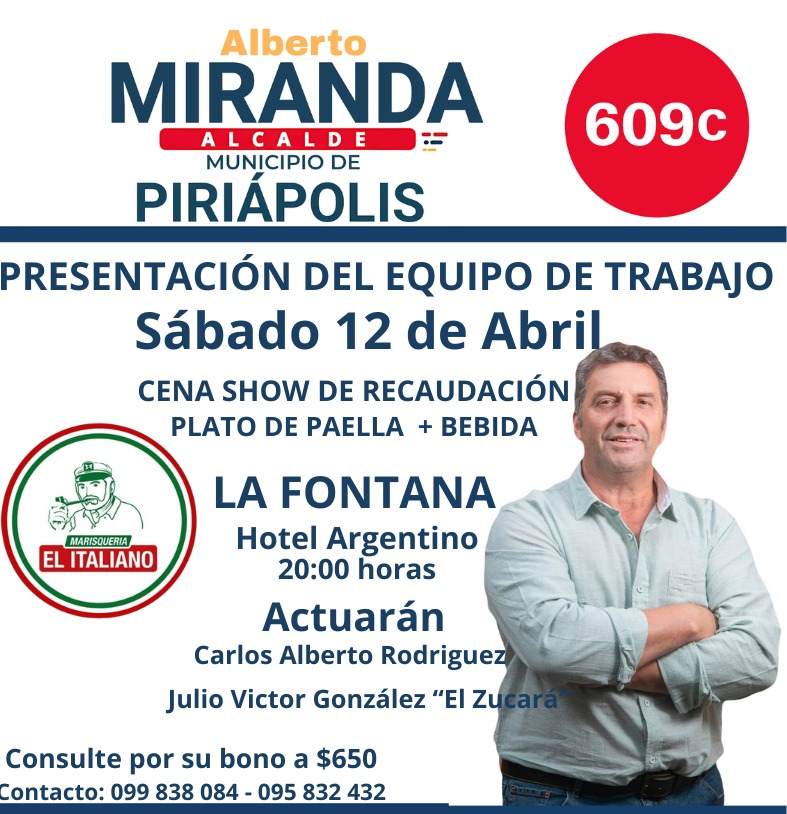 Piriápolis: Miranda presenta su equipo de trabajo con cena de recaudación; actúan El Zucará y Carlos Alberto Rodríguez Alberto Miranda, candidato a alcalde por el Municipio de Piriápolis, invita a la presentación oficial de su equipo de trabajo. La instancia política se llevará a cabo el próximo sábado 12 de abril, a la hora 20:00, en La Fontana del Argentino Hotel. En la ocasión, se realizará una cena show de recaudación, con un menú que incluye paella y bebida, siendo el costo del ticket $U 650. Actuarán Carlos Alberto Rodríguez y Julio Victor González «El Zucara».