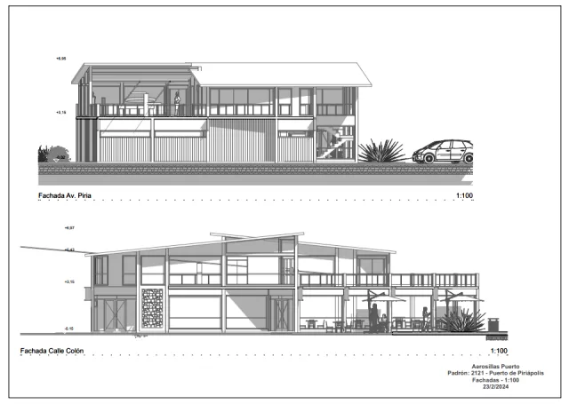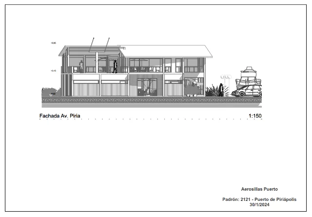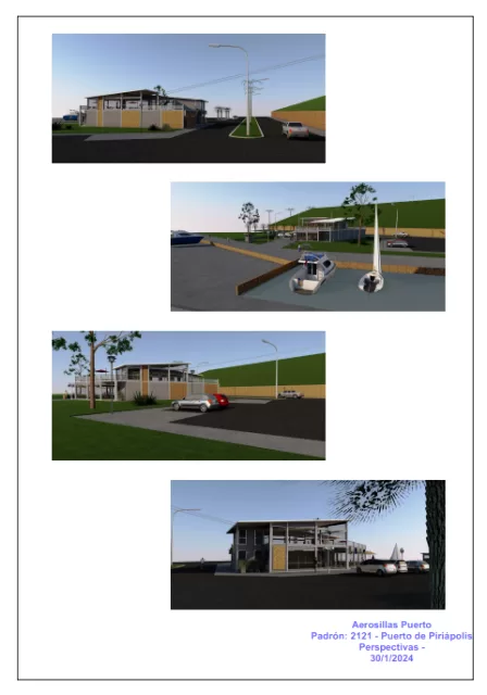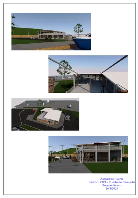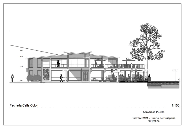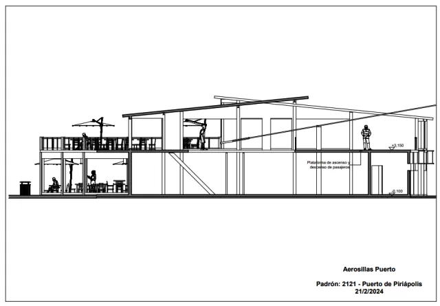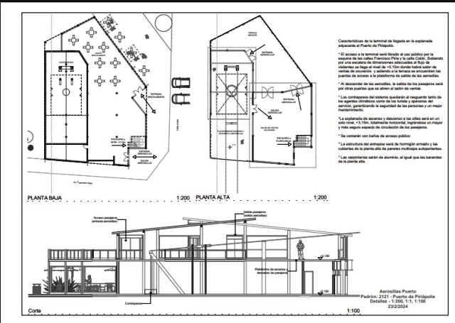 El proyecto, elaborado bajo el padrón 2121 del Puerto de Piriápolis, contemplaba un rediseño integral de la terminal de acceso, ubicada en la esquina de avenida Francisco Piria y calle Colón. Los planos y detalles técnicos —fechados entre enero y febrero de 2024— muestran una estructura moderna con una plataforma de ascenso y descenso al nivel +3,15 metros, una terraza mirador, salón de ventas y souvenirs, y un restaurante con vista al puerto.